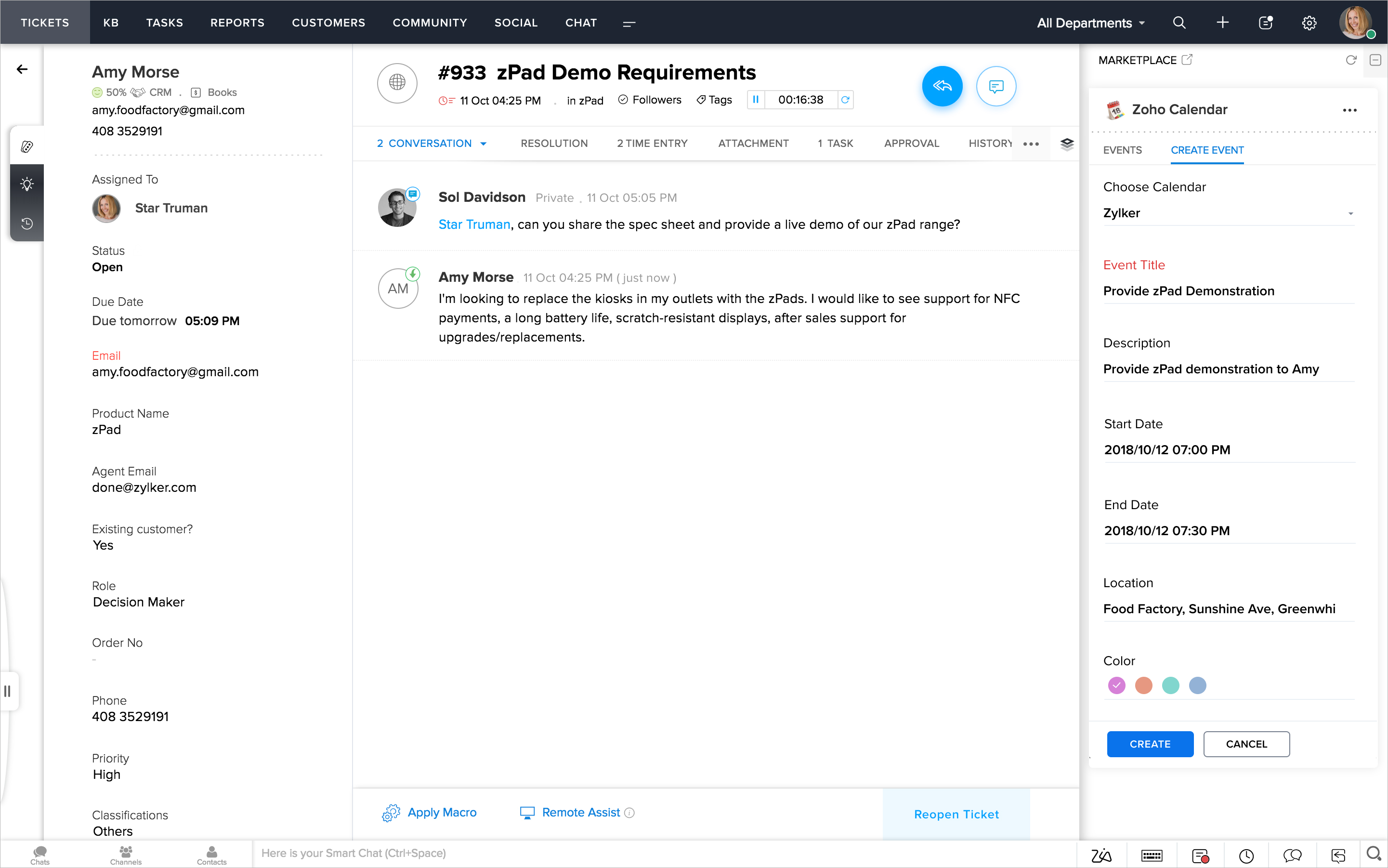 The Zoho Calendar extension for Zoho Desk lets you attach calendar events to tickets with a simple click. You can record your scheduled appointments for tickets like customer demonstrations, remote assistance sessions, site visits, etc. and sync them with Zoho Calendar. The extension also allows you to set up reminders so you don't miss important events.