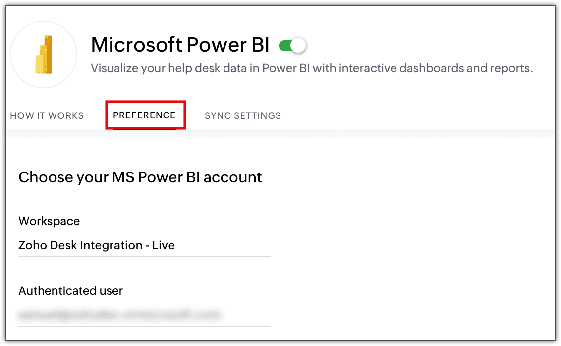 Setting the preferences - The admin must select a workspace from PowerBI to link with Zoho Desk.