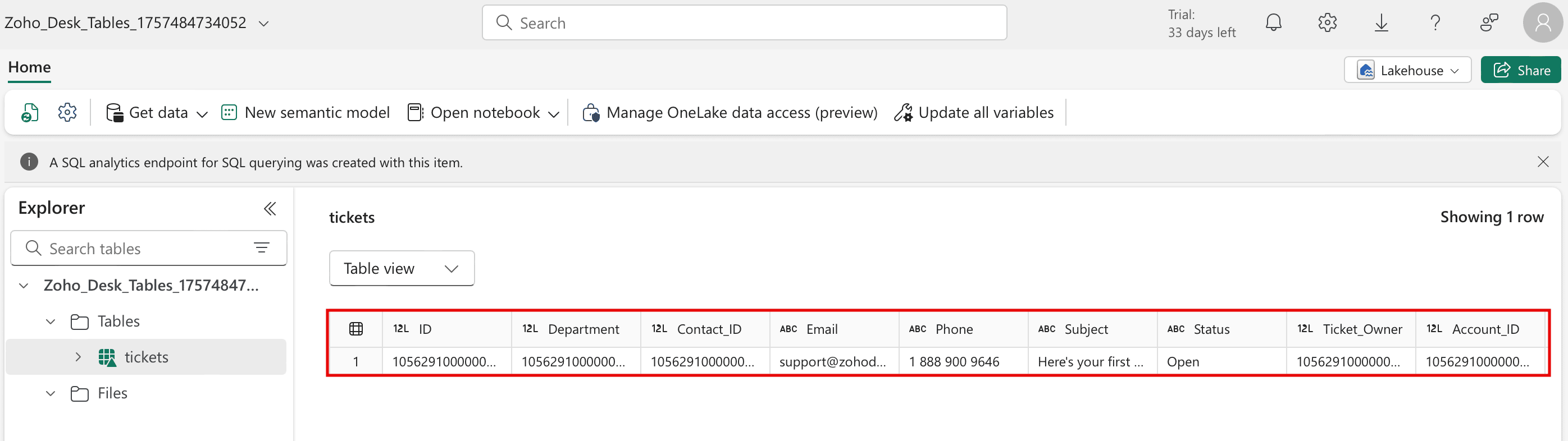 The modules and fields selected in the Zoho Desk will be displayed in a table format in the PowerBI workspace.