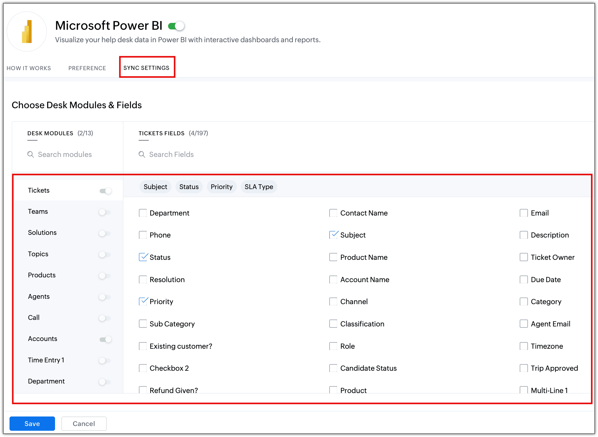 Defining the Sync settings - The admin can choose the modules and fields in Desk to sync with the PowerBI via the Sync Settings tab. For example, if you want to visualize only the ticket module and the priority, product name, and SLA fields, you can select them from Zoho Desk.