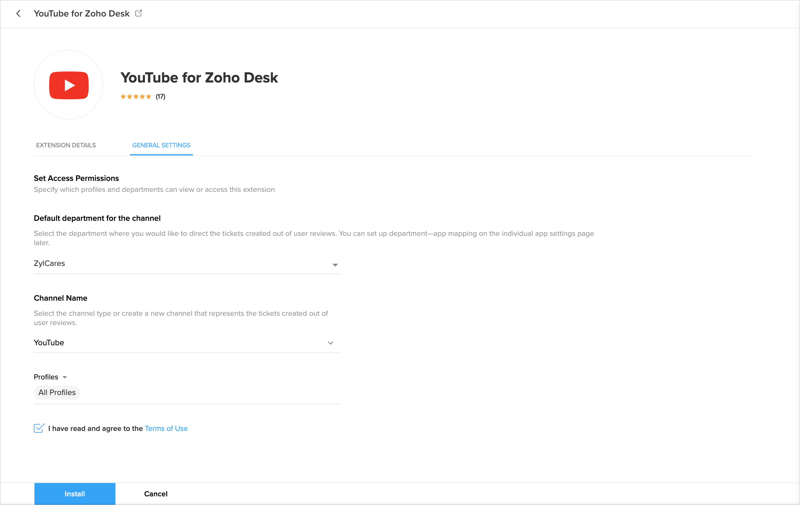 4. Select the YouTube for Zoho Desk extension and click Install.
