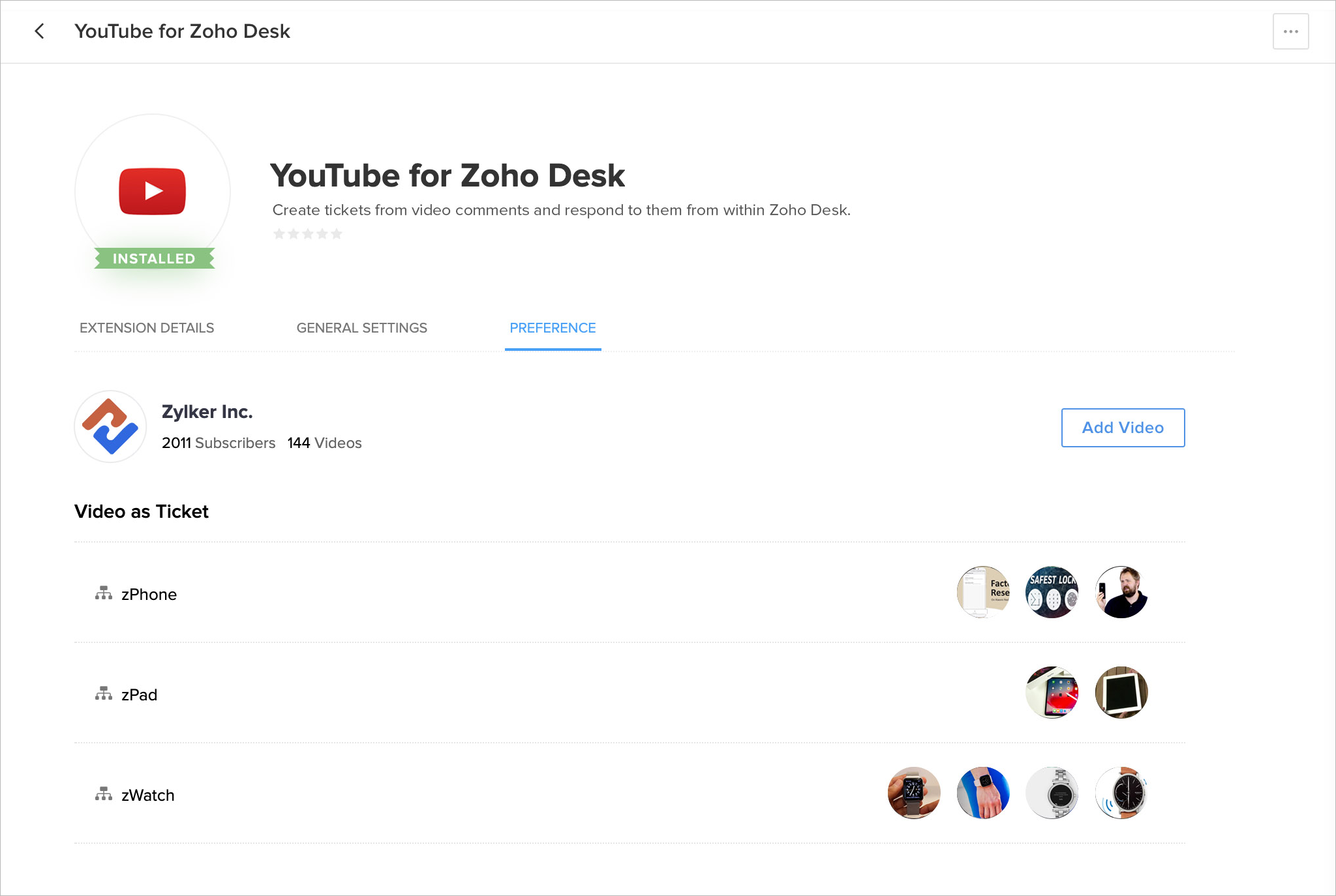 The YouTube extension can be installed from the Zoho Marketplace or your Zoho Desk account.