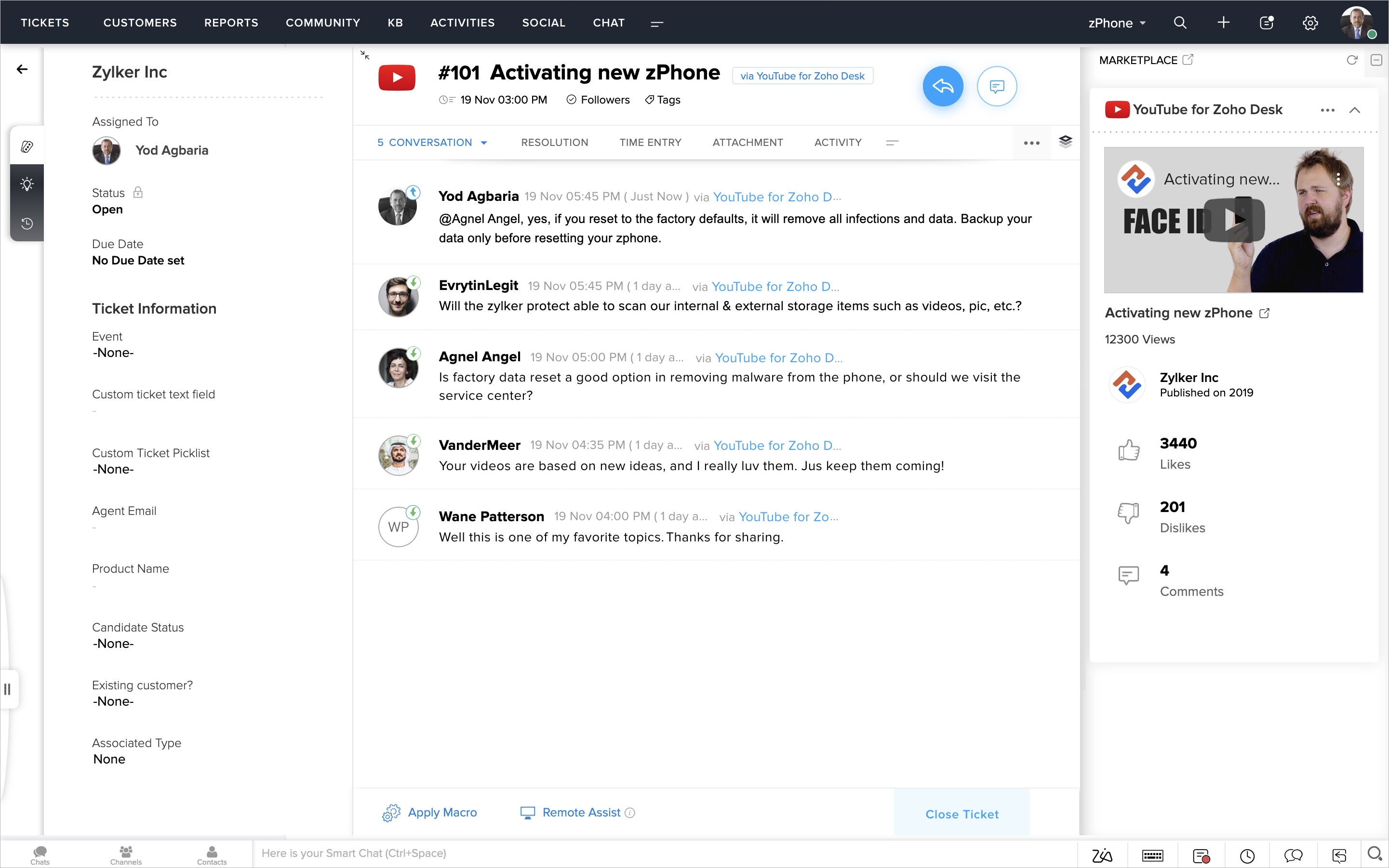 4. Since Zoho Desk connects to YouTube as a ticket channel, you will be able to resolve tickets by taking advantage of Zoho Desk's views, workflows, and macros