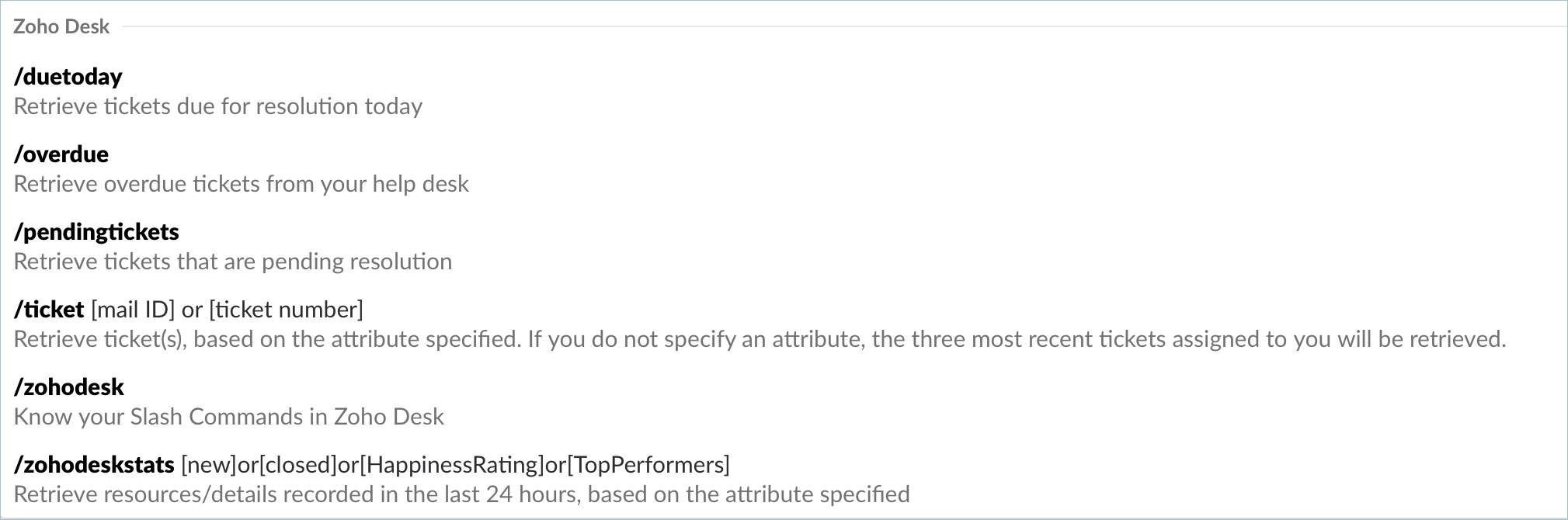 After integrating your Zoho Desk portal and Slack workspace, you can retrieve ticket-related information right from Slack using slash commands.