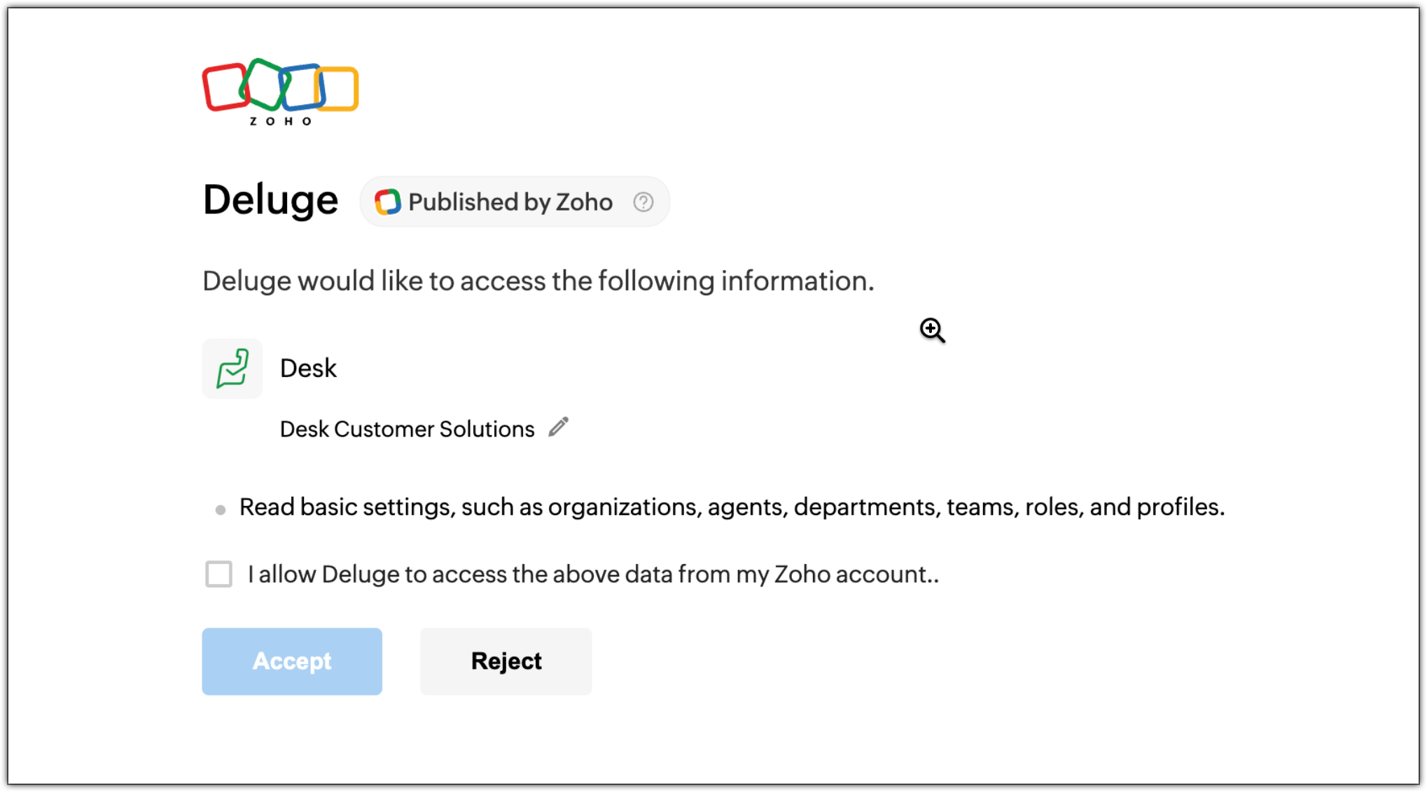 - The Zoho OAuth authorization page will open. Click Connect.