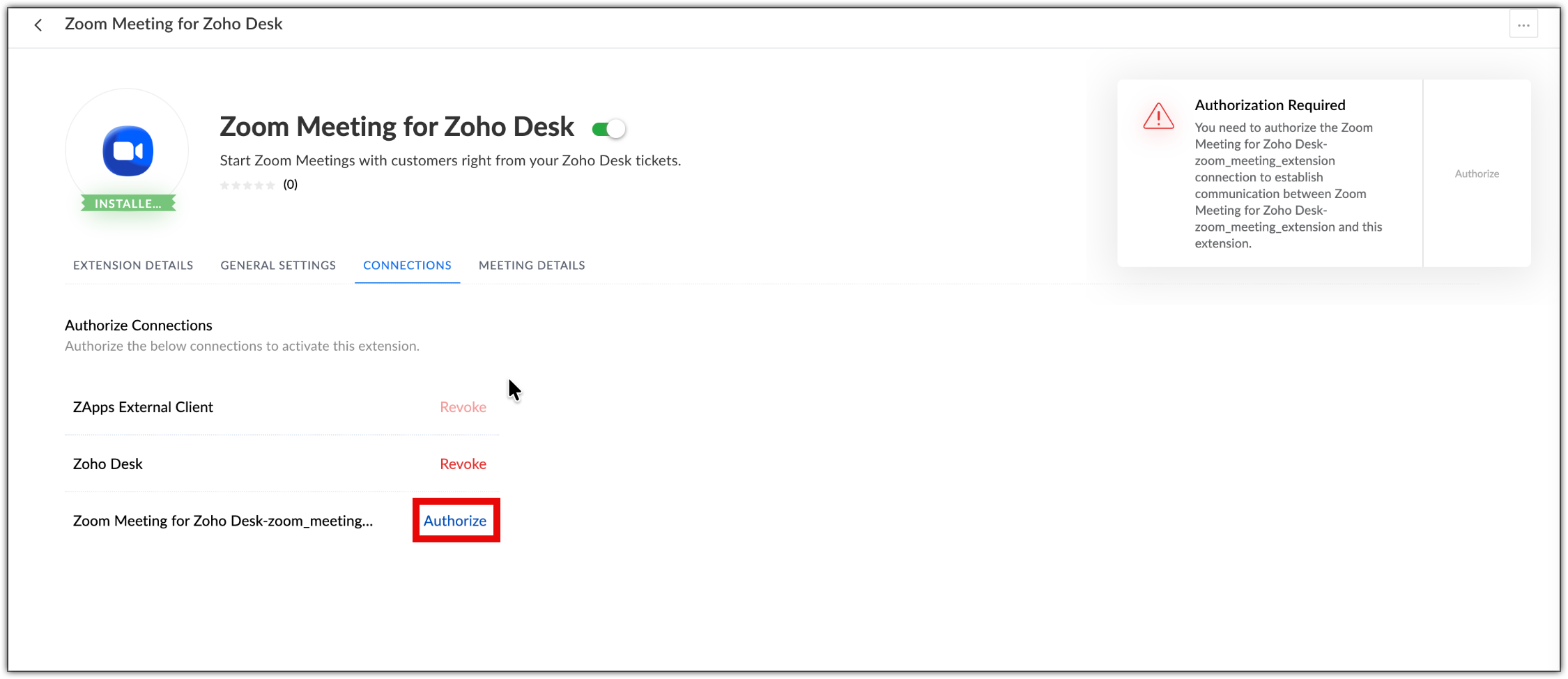 - Click the Zoom Meeting for Zoho Desk extension.