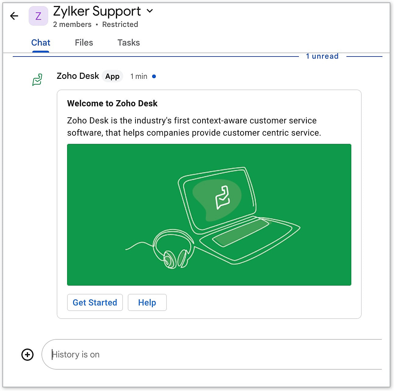 A Zoho Desk welcome card appears automatically in your chat space.