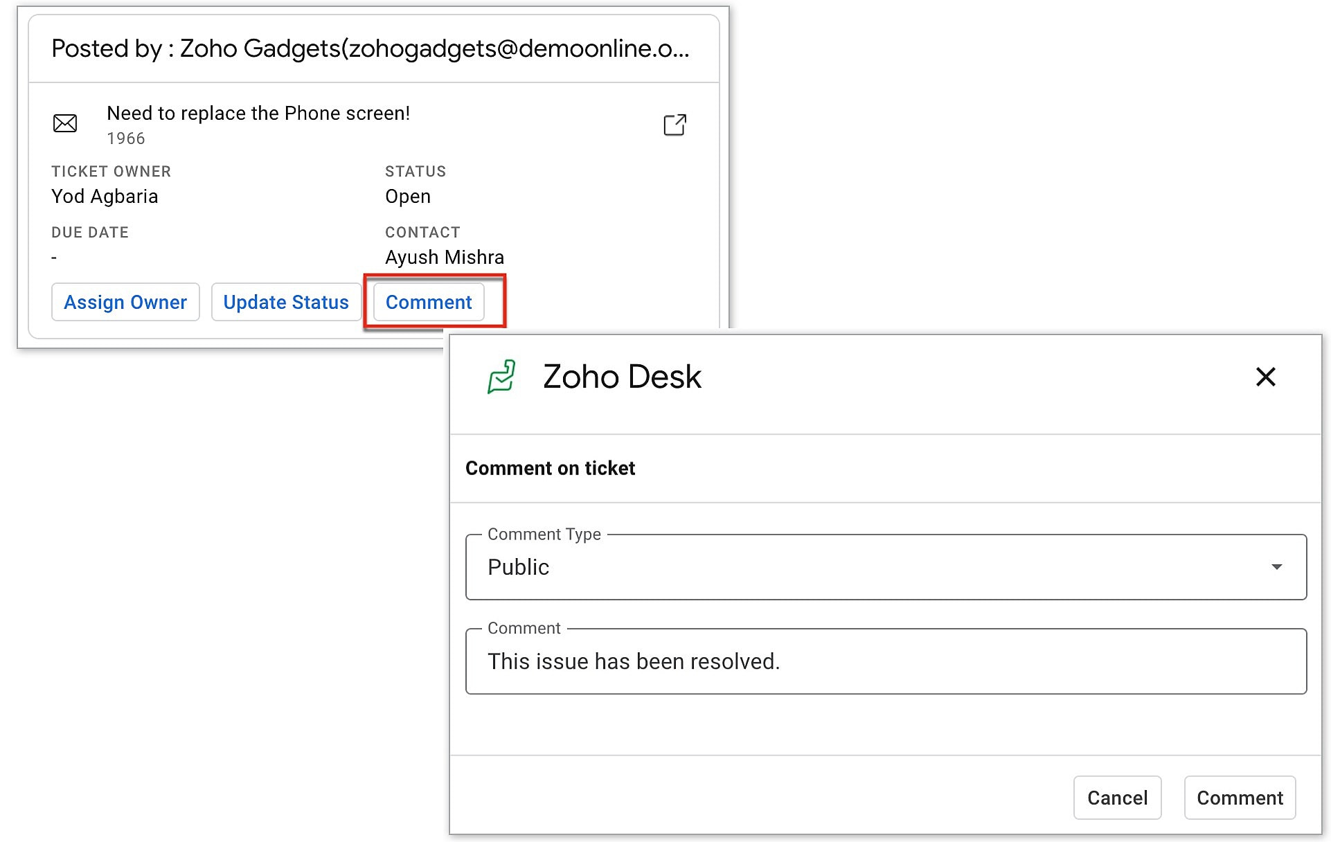 - Add public or private comment in a support ticket.