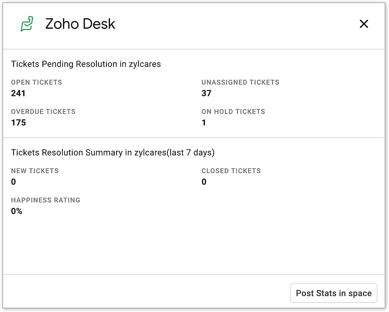 - /zohodesk_stats - To fetch and display the last seven days of Desk statistics directly within the Google Chat Space.