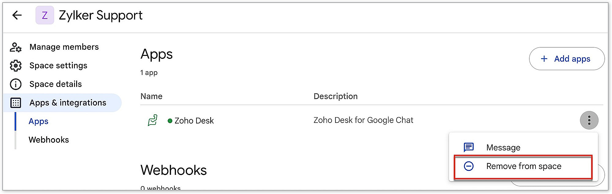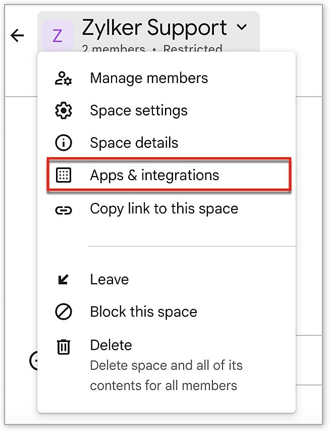 - Click the [Space name] drop-down and select Apps & integrations.