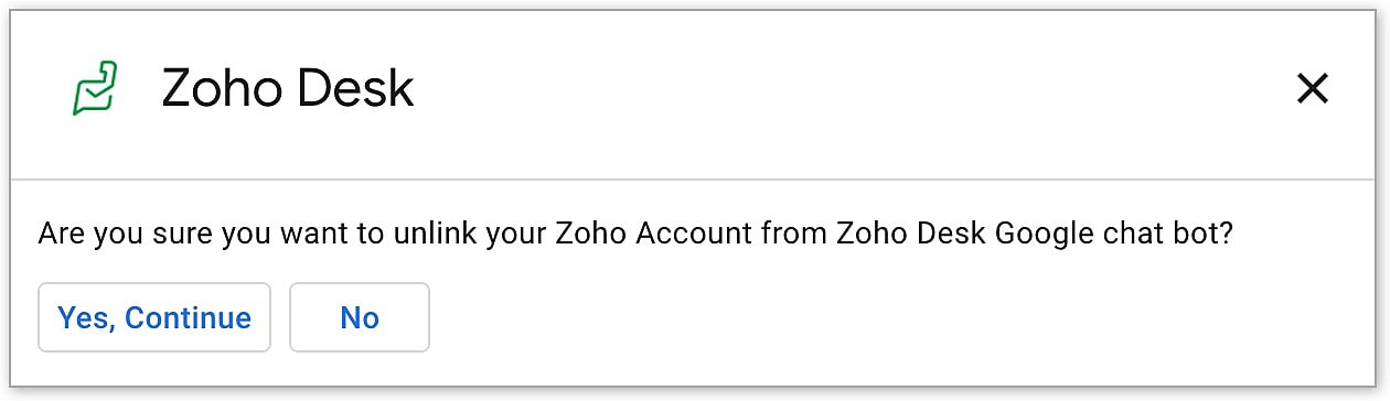 - /zohodesk_revoke - This command allows the user to unlink Zoho Desk and Google Chat within a specific Space. Other users sharing the same space can continue to use the integrations. However, the user won't receive individual notifications from Desk. Note that this doesn't removes the integration of Desk and Google Chat.