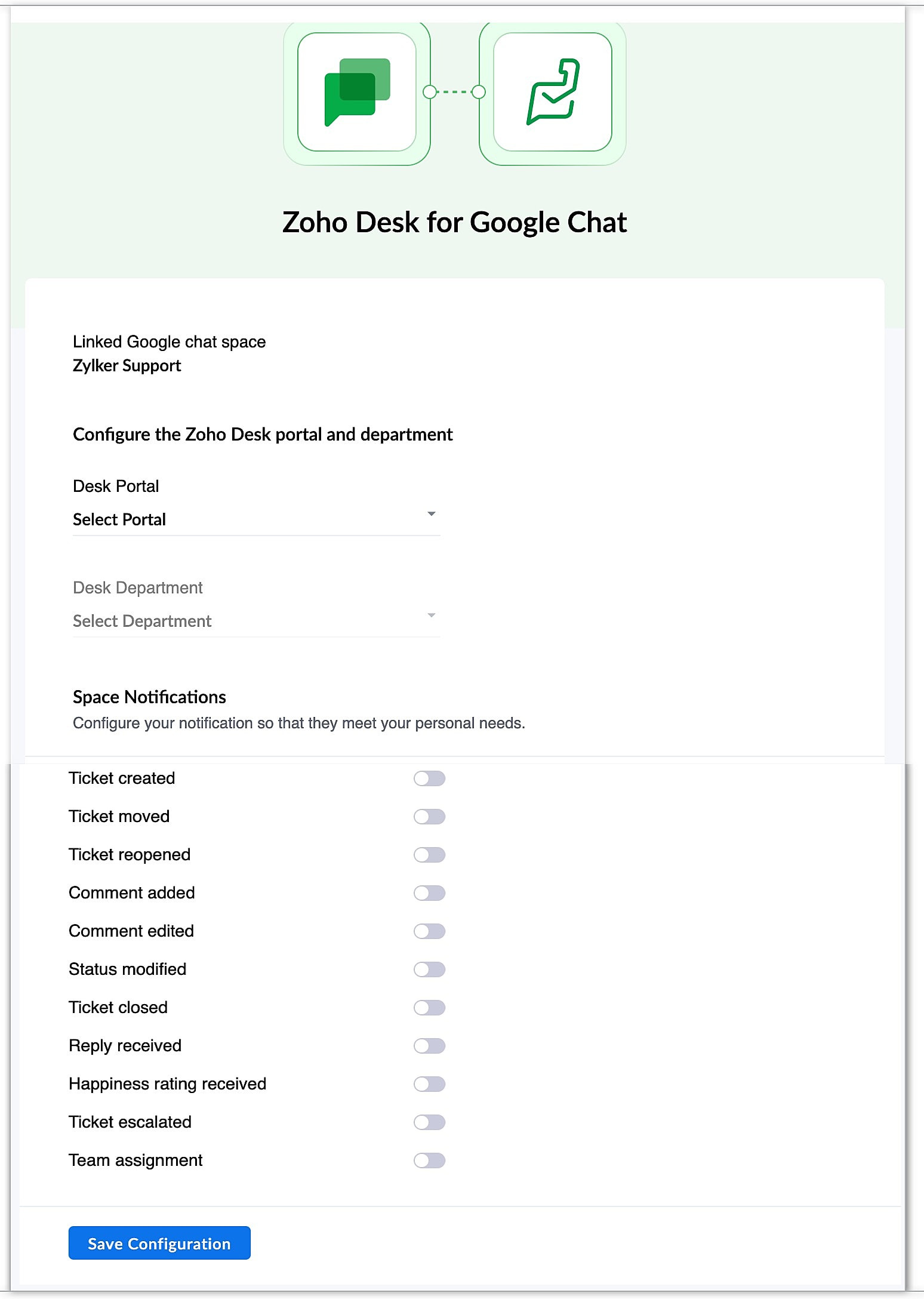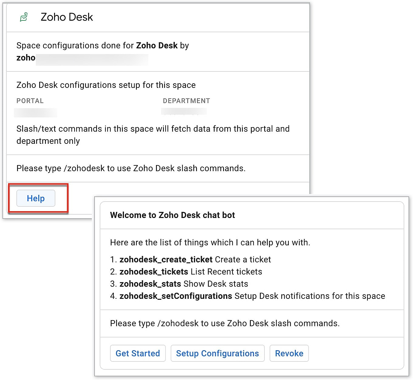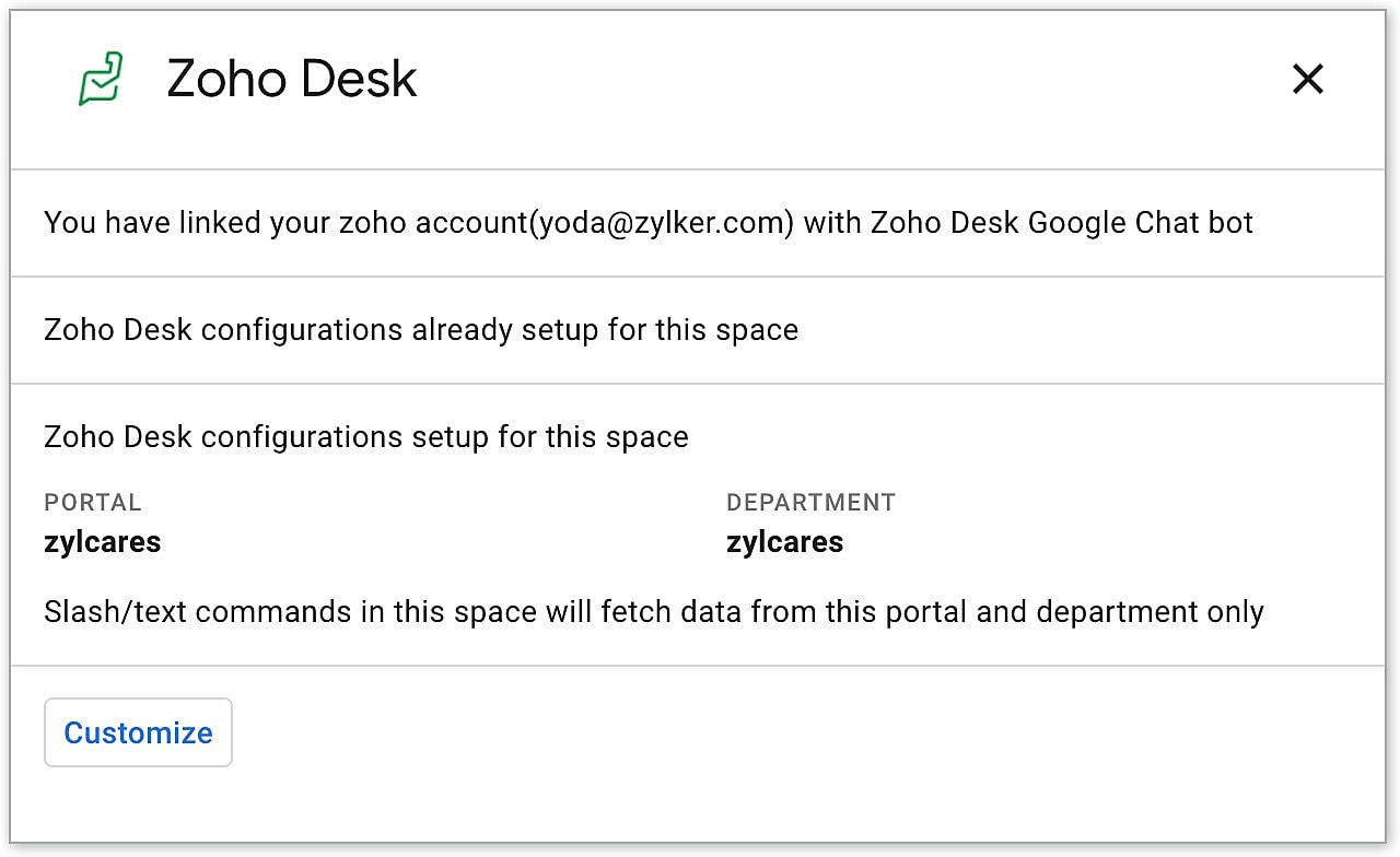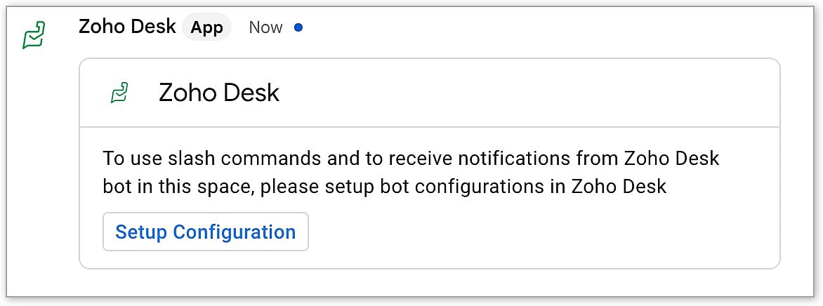 - /zohodesk_setConfigurations - Use this command to view or modify the configuration settings for the respective Google Chat Space.
