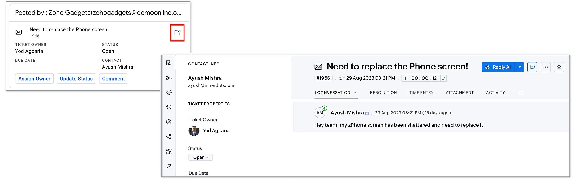 - View the support ticket in Zoho Desk in a separate tab.