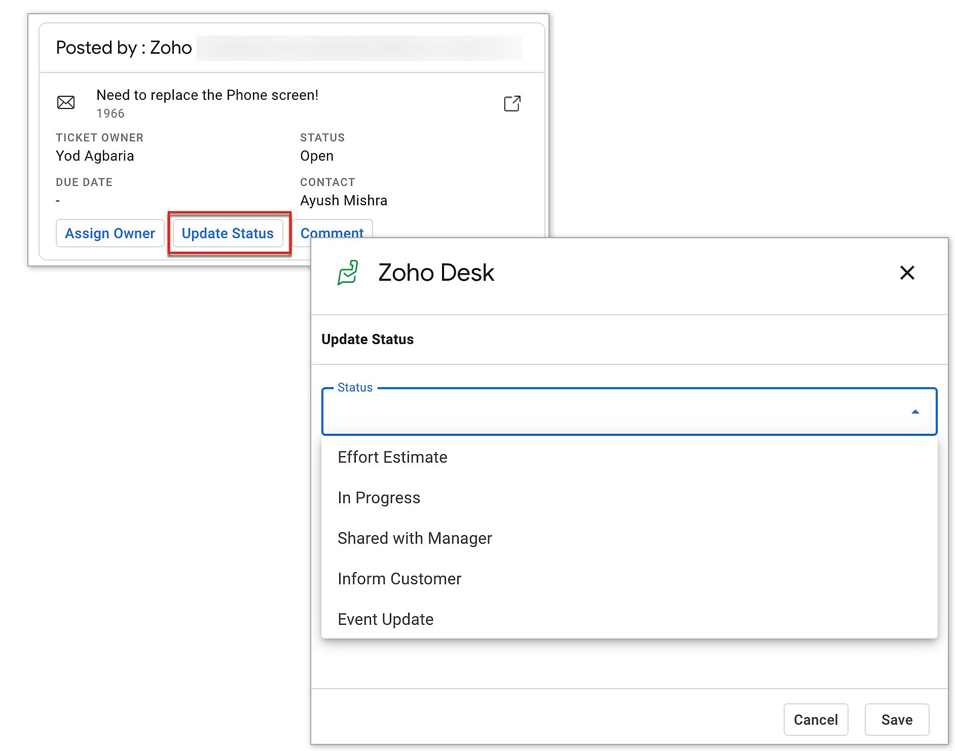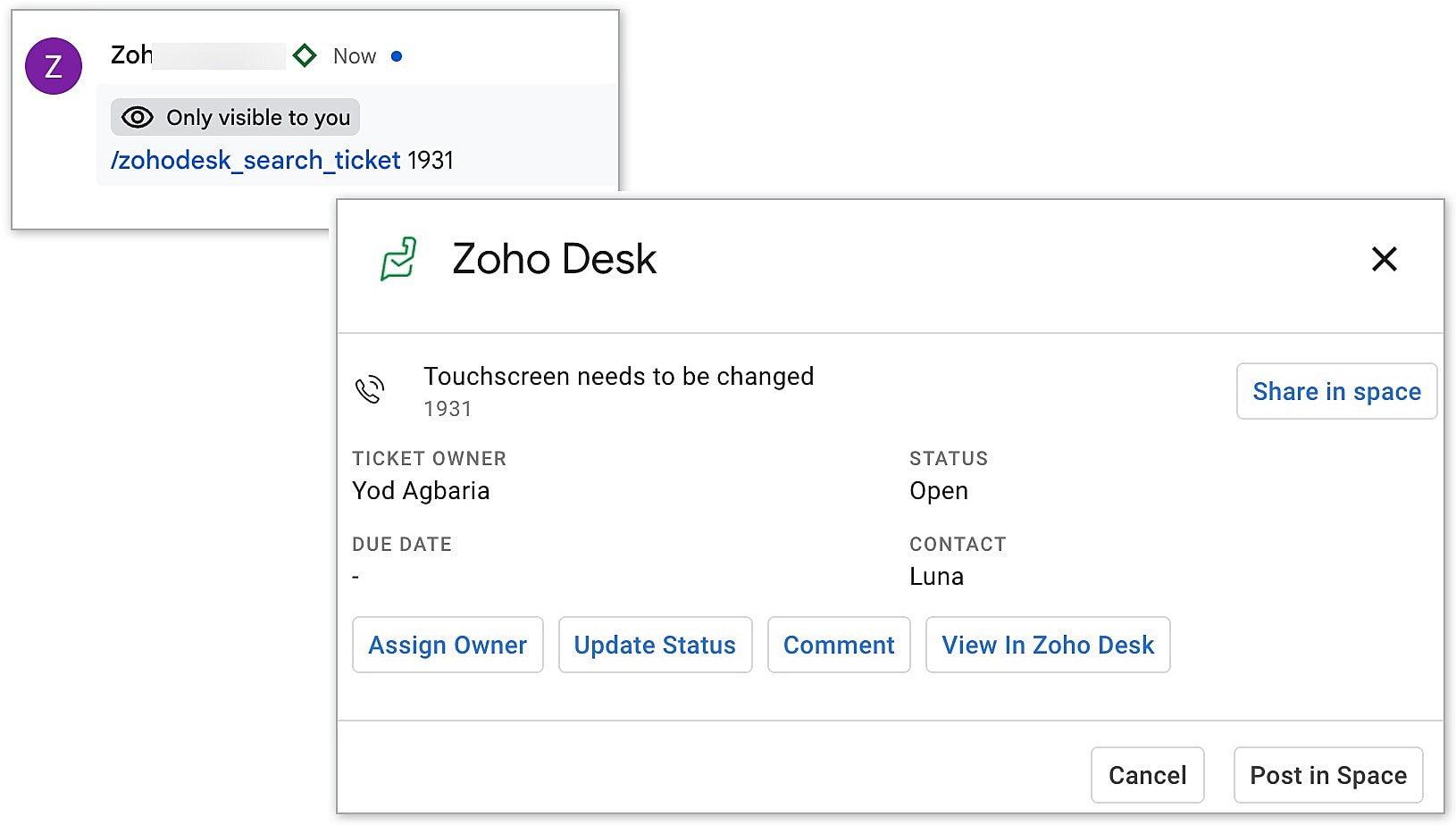 - Users can execute the actions mentioned below on the tickets within the Google Chat Space based on their profile permissions defined in the Zoho Desk. For example, a support agent with relevant permissions could update a ticket's status directly from Google Chat, whereas individuals lacking the requisite permissions would be unable to update the status of the ticket.