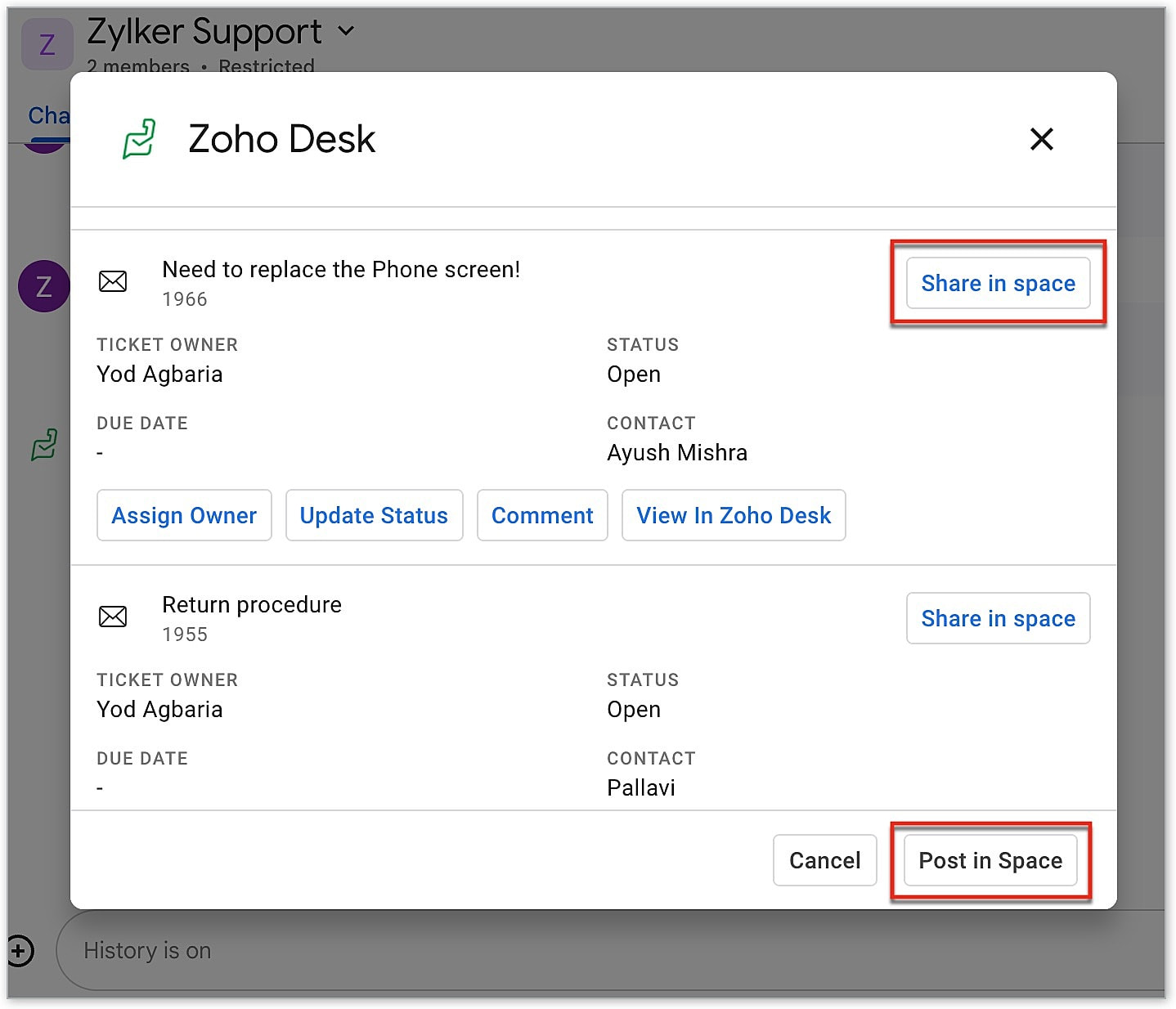 - /zohodesk_tickets - This command lists the ten most recent support tickets from the selected Desk department configured for the Google Chat Space. In the tickets pop-up window, users can perform the following actions: