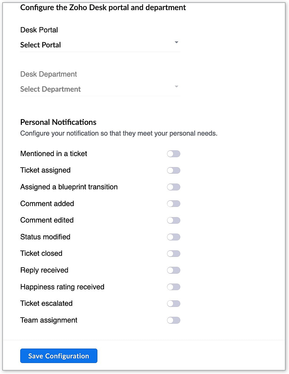 - Click Setup Configuration to configure Zoho Desk for personal chat.