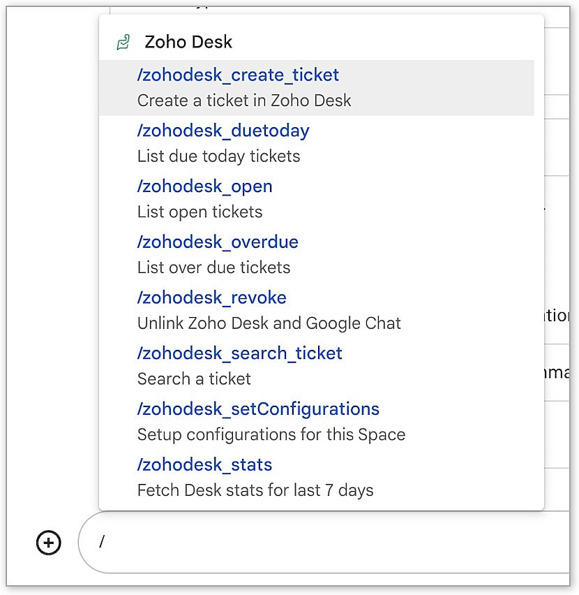 - In the Google Chat Space window, type / (slash) to use the Zoho Desk slash commands.