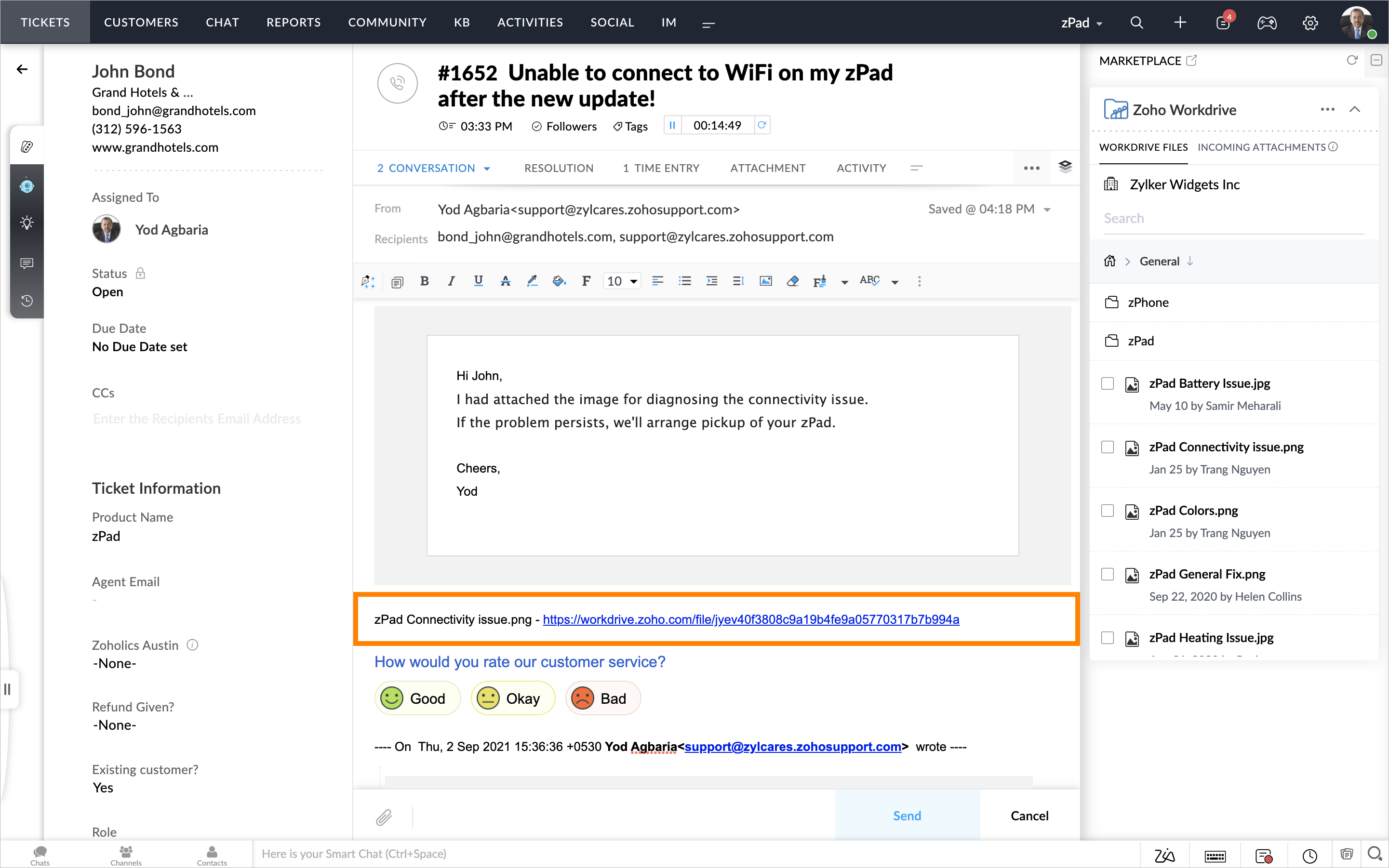 • Share links to your WorkDrive files in tickets along with the access permission you wish to assign to it.