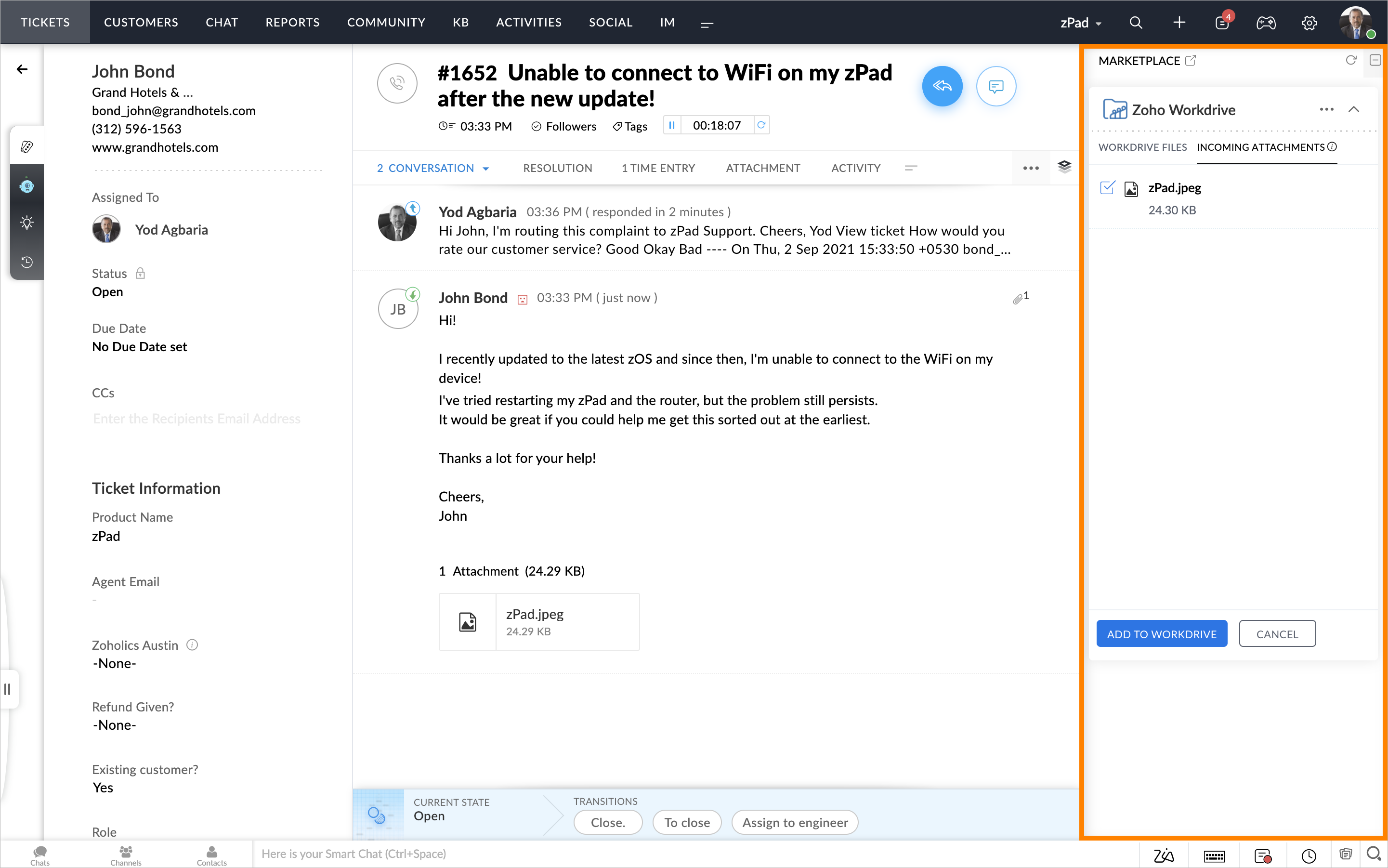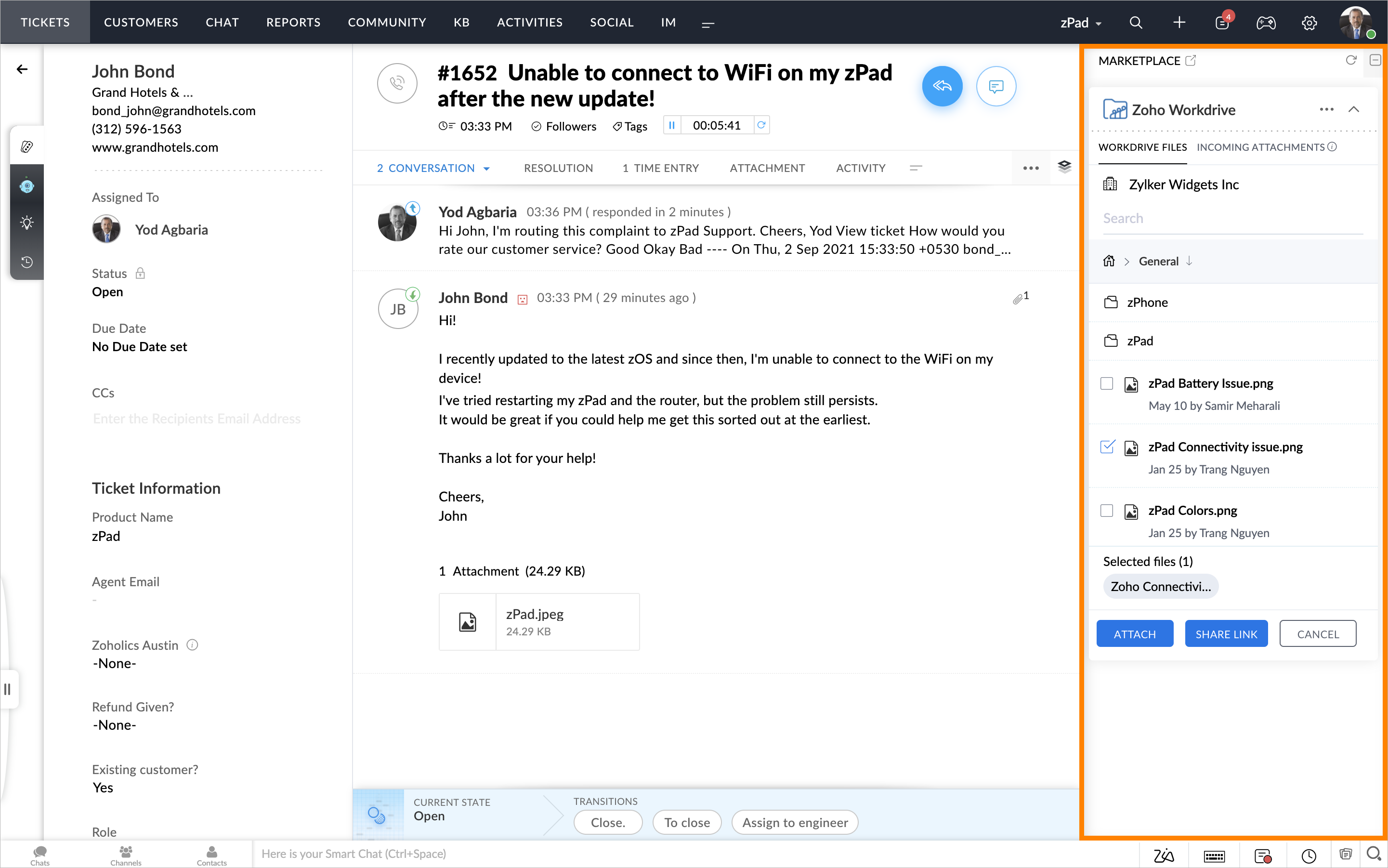 You can attach or share links to files from your WorkDrive account  in a ticket. To attach files:
