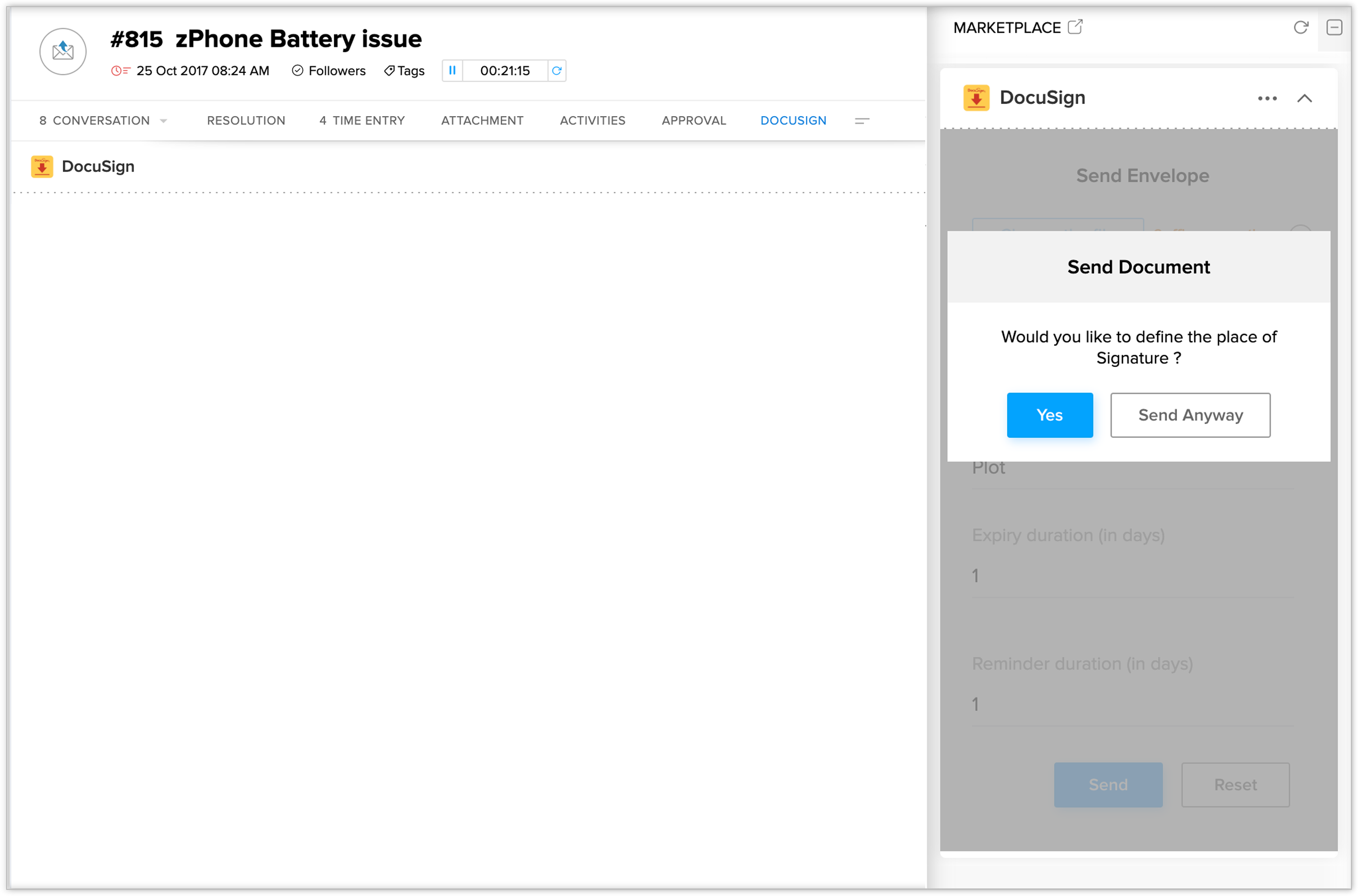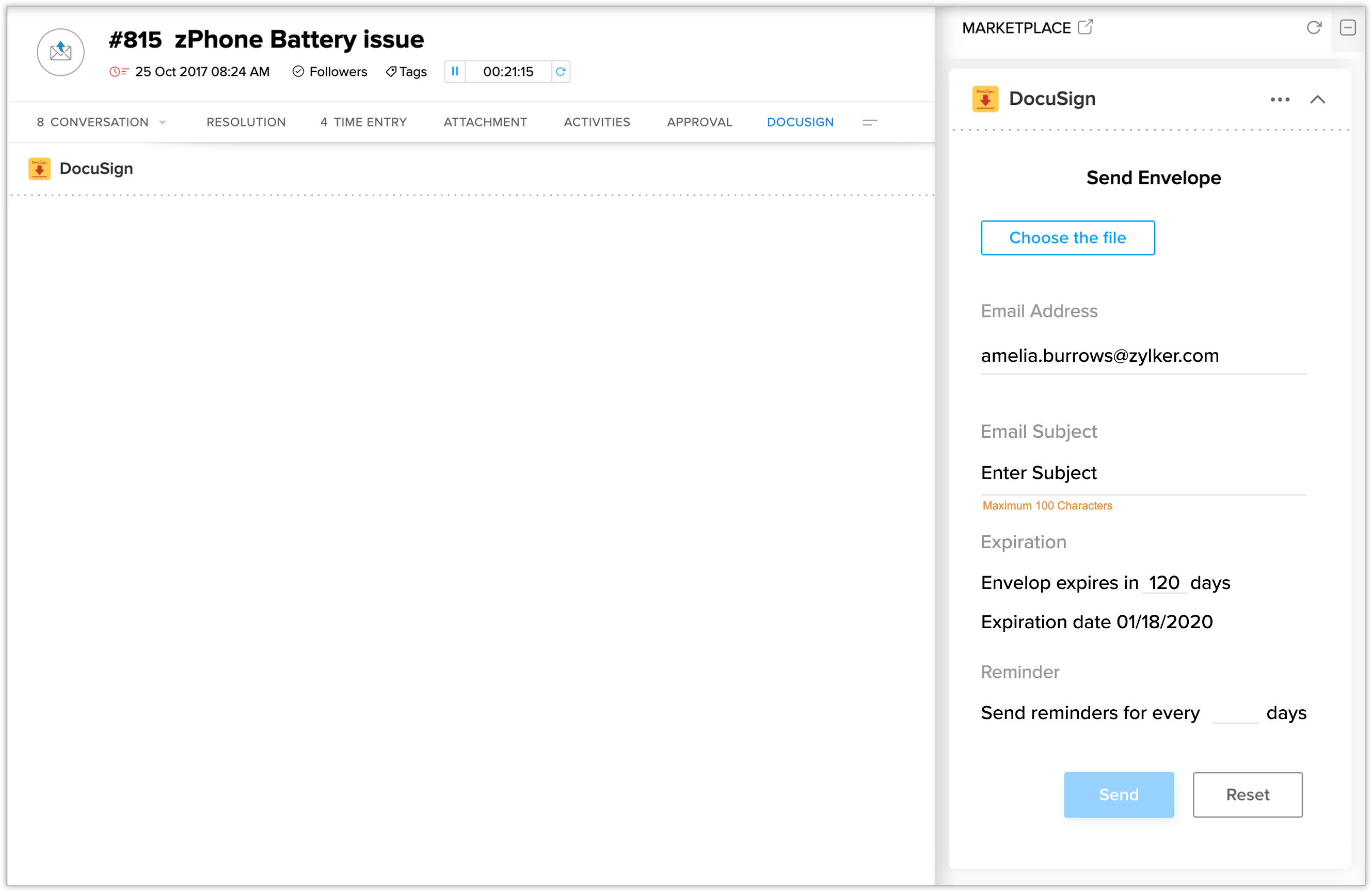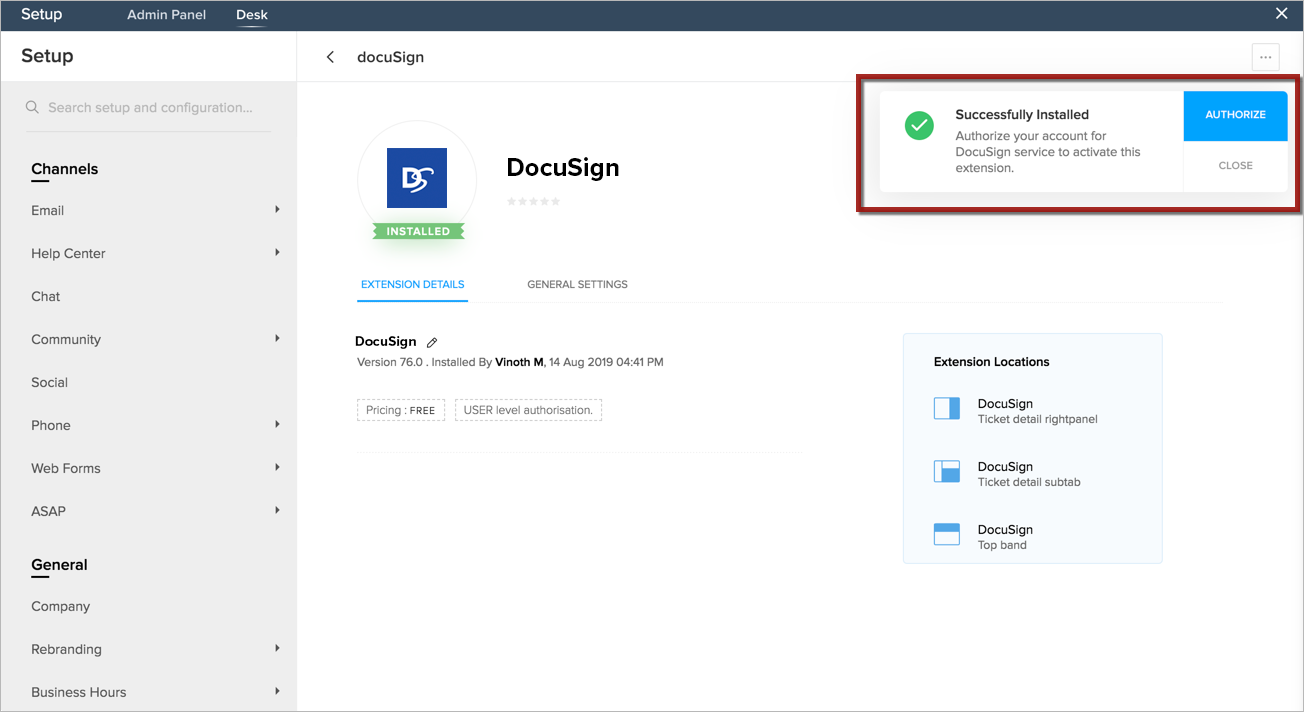 The DocuSign extension can be installed from the Zoho Marketplace or from your Zoho Desk account.