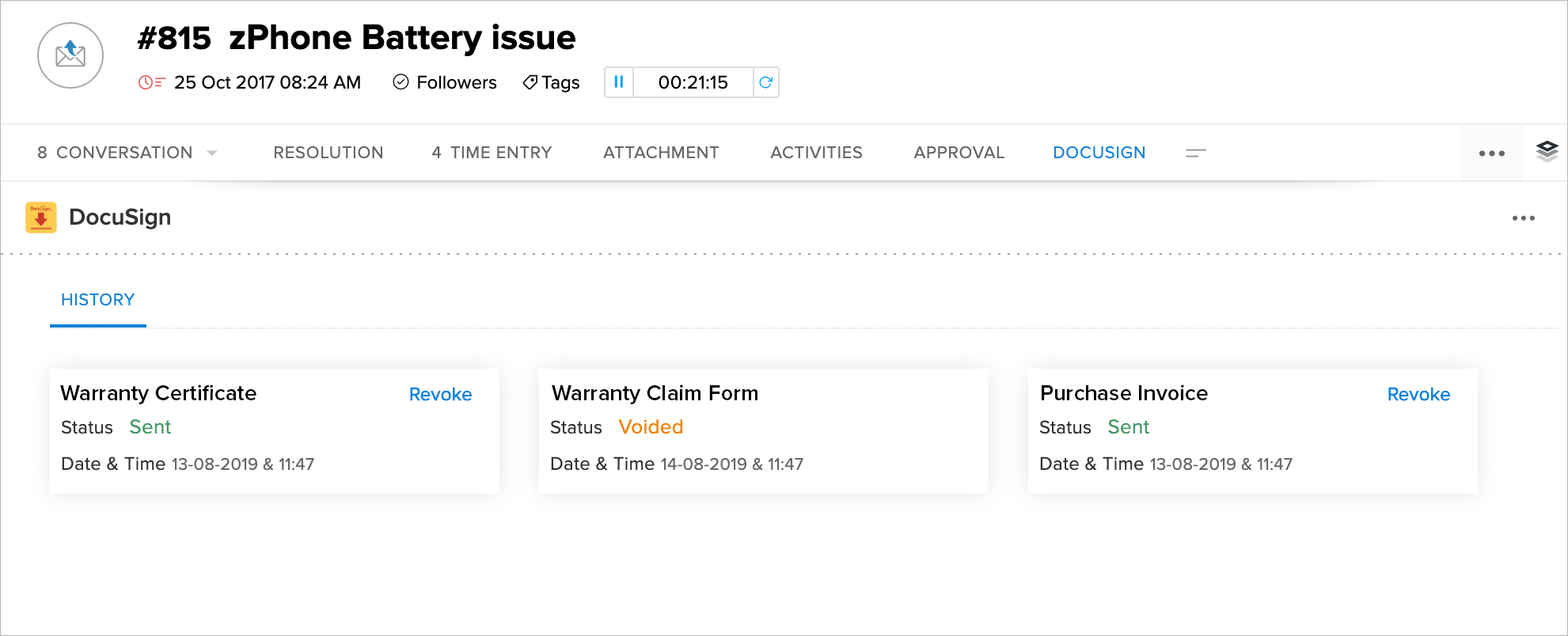 The full envelope list from DocuSign can be viewed from two different locations in Zoho Desk The top band or the Ticket Detail subtab.