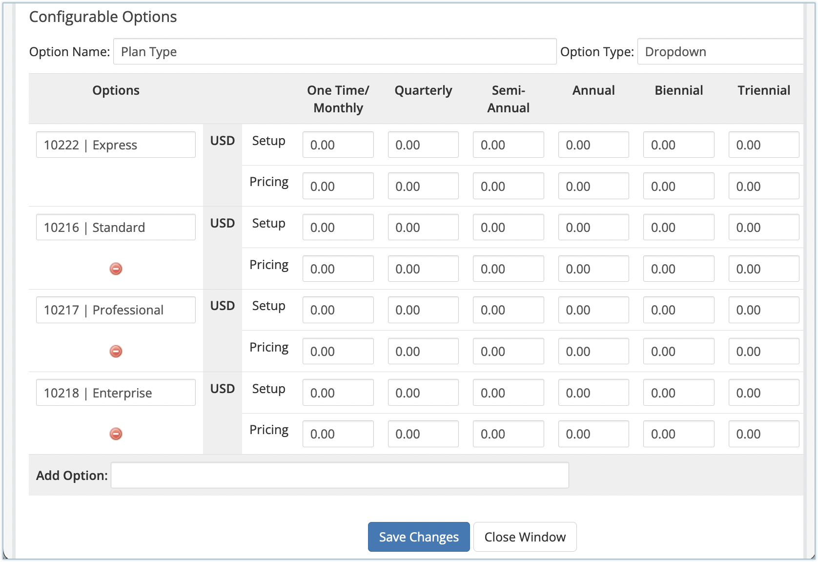 Click Close Window to return to the Configurable Options page. The configured option will be listed at the bottom of the page.
