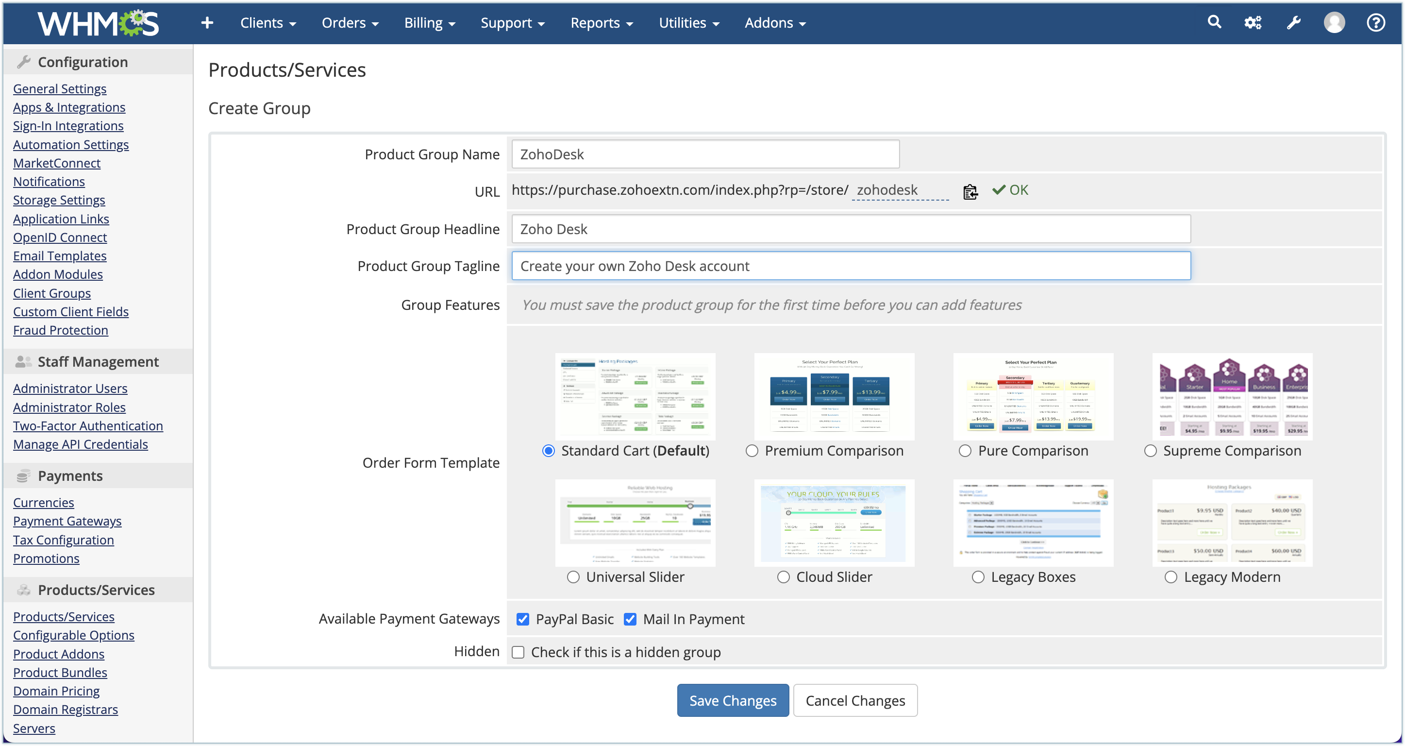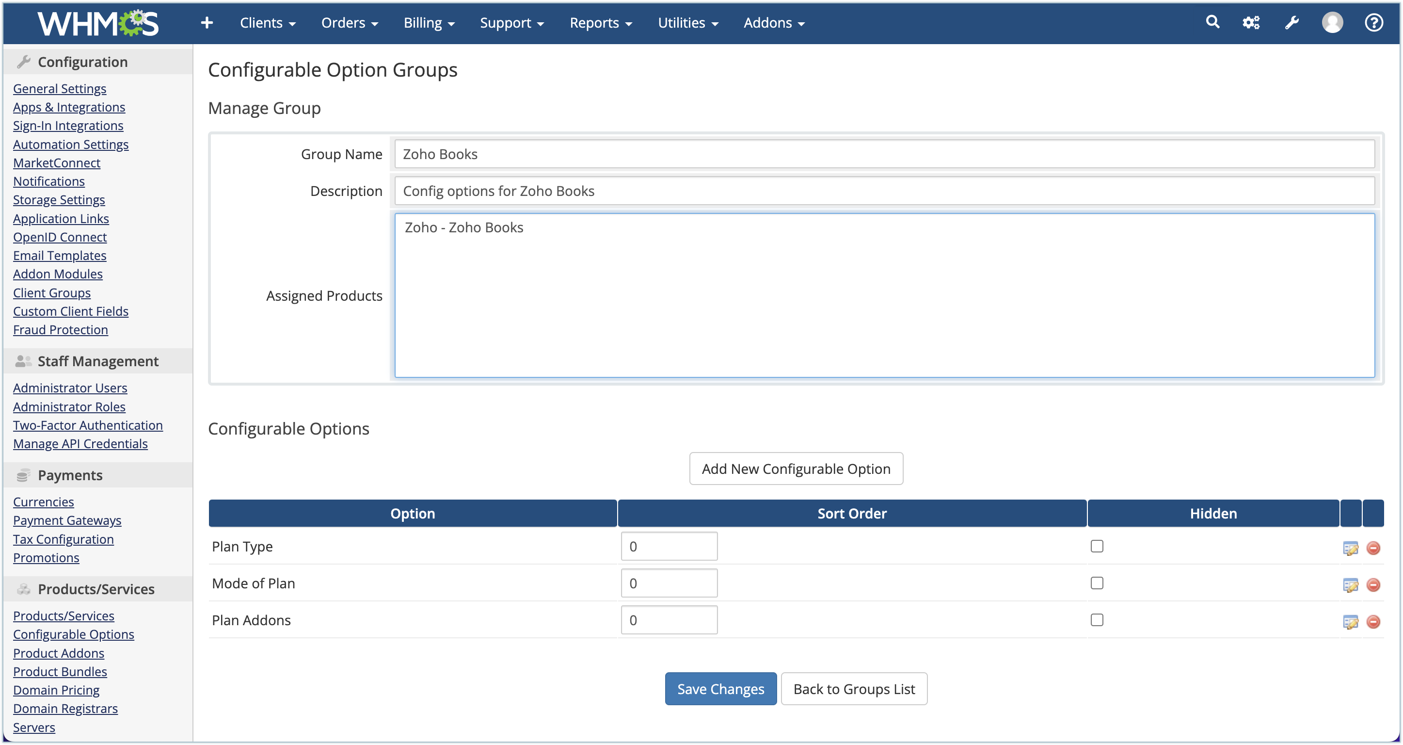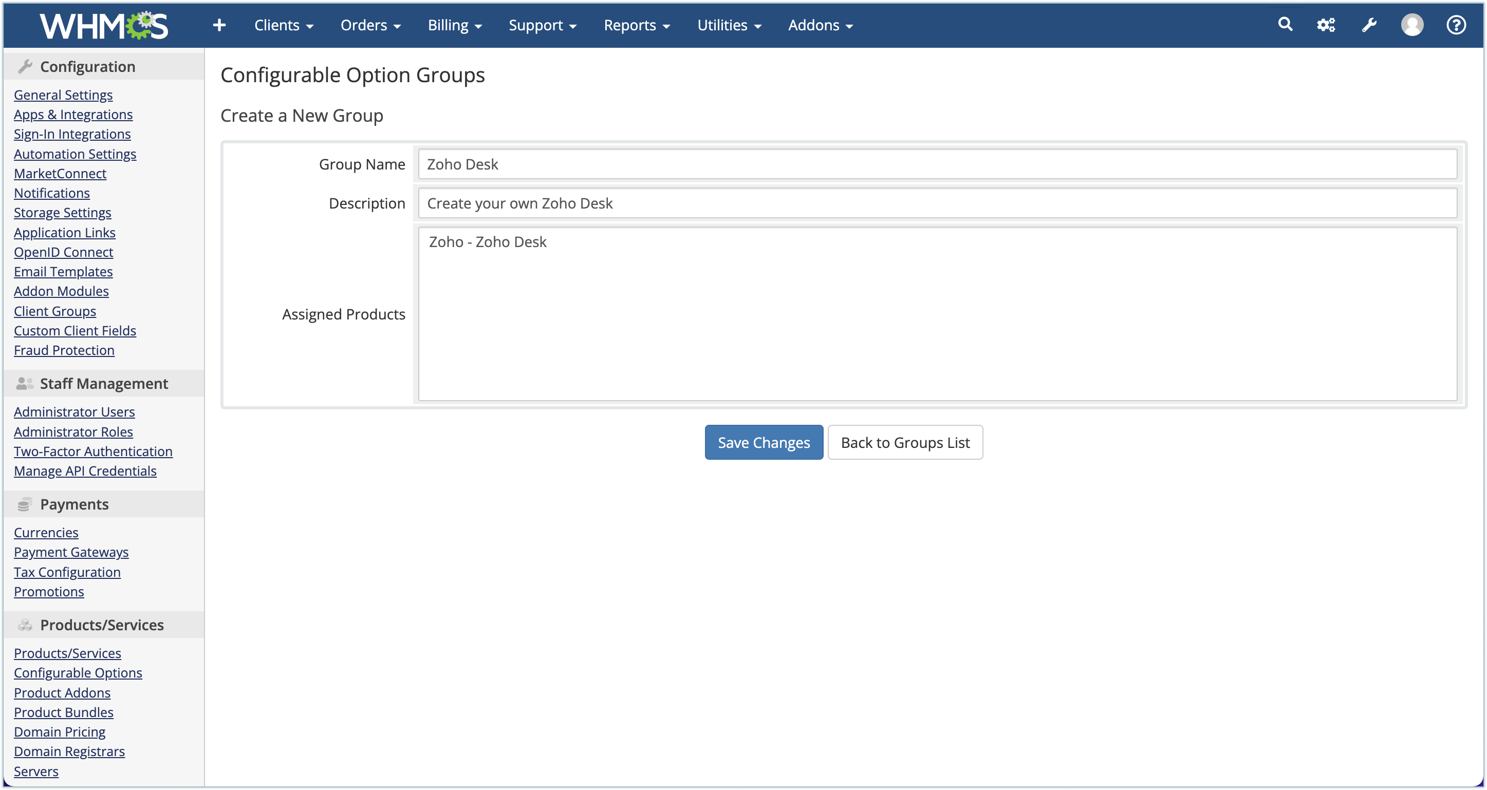 The Zoho Desk module is created within a group in WHMCS. To configure the Zoho Desk module in WHMCS, create a group, then add Zoho Desk as a product within it. You can also use existing groups to configure the Zoho Desk module.