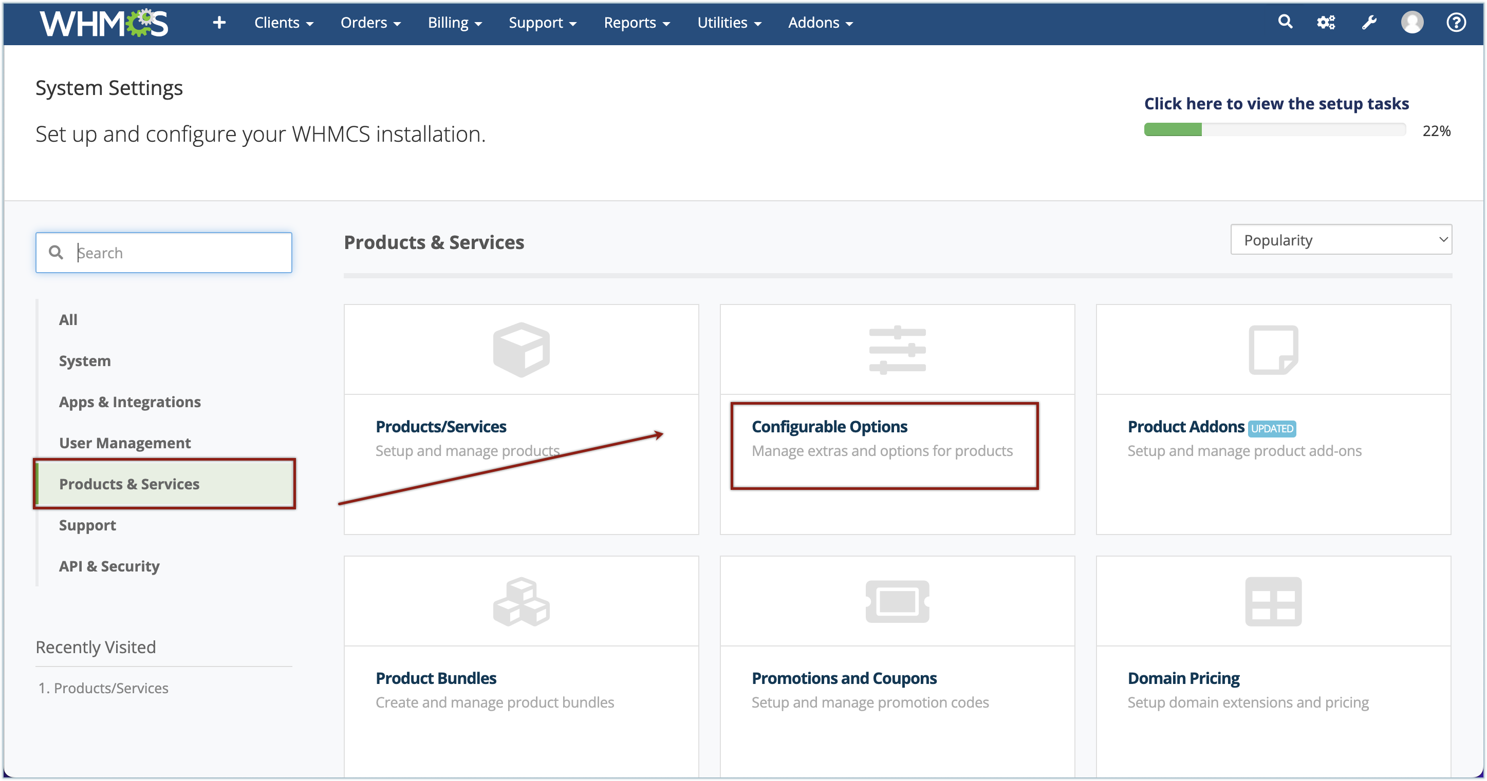 In the admin page of your WHMCS account, navigate to Setup > System Settings > Products/Services > Configurable Options.