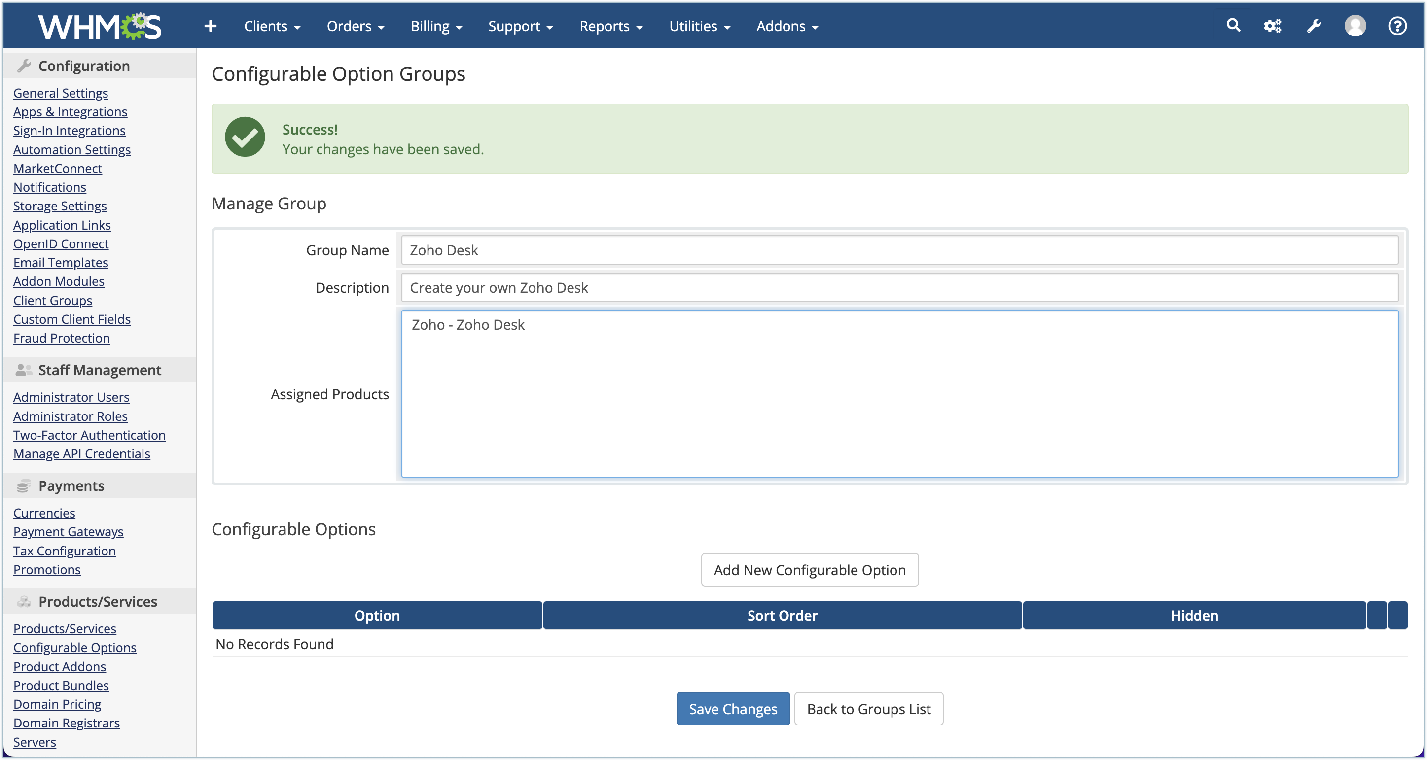 Zoho Desk module will be successfully installed and configured in your WHMCS admin panel. It's now ready to be purchased by your customers.