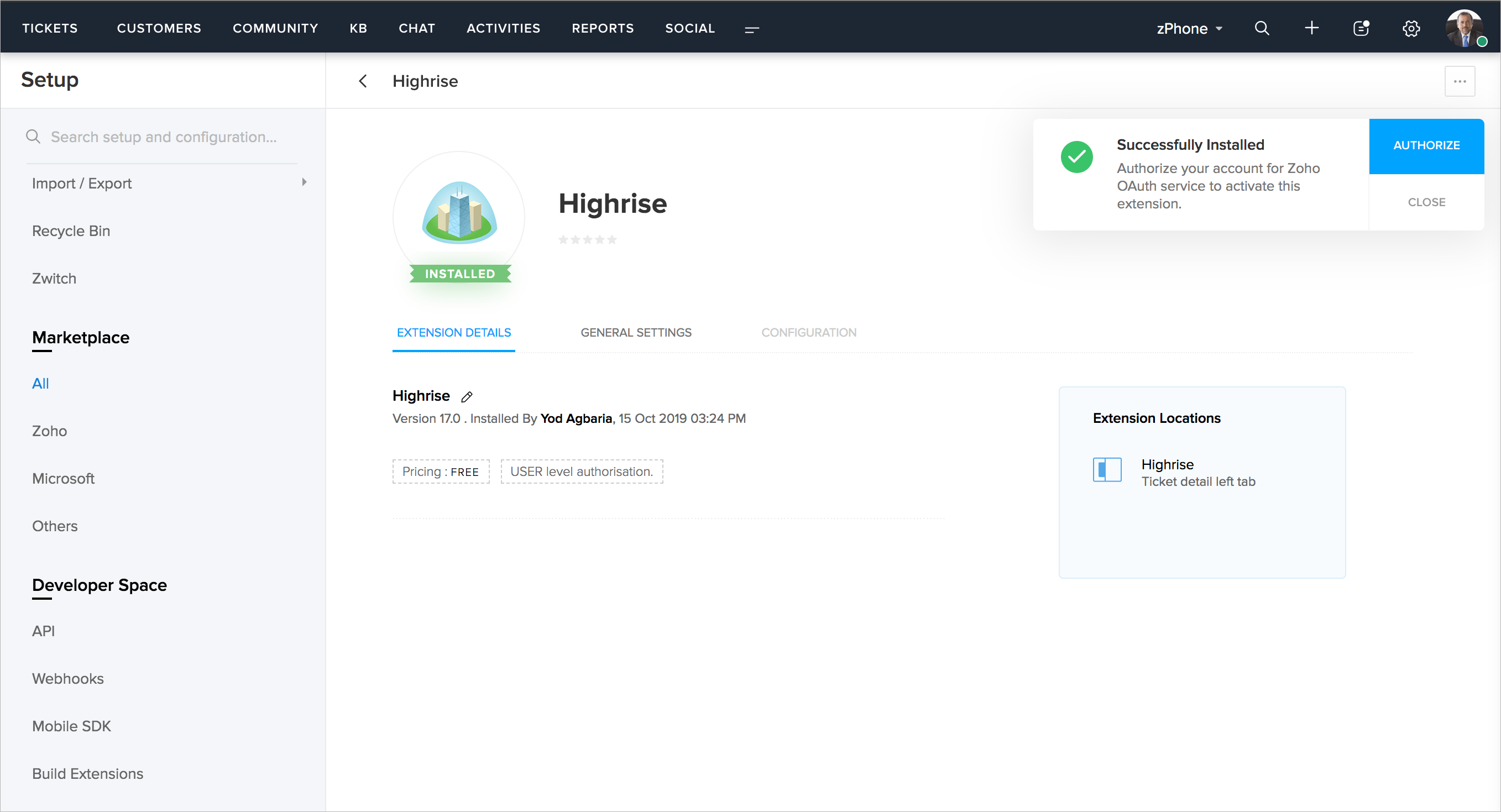 The Highrise extension can be installed from the Zoho Marketplace or from your Zoho Desk account.