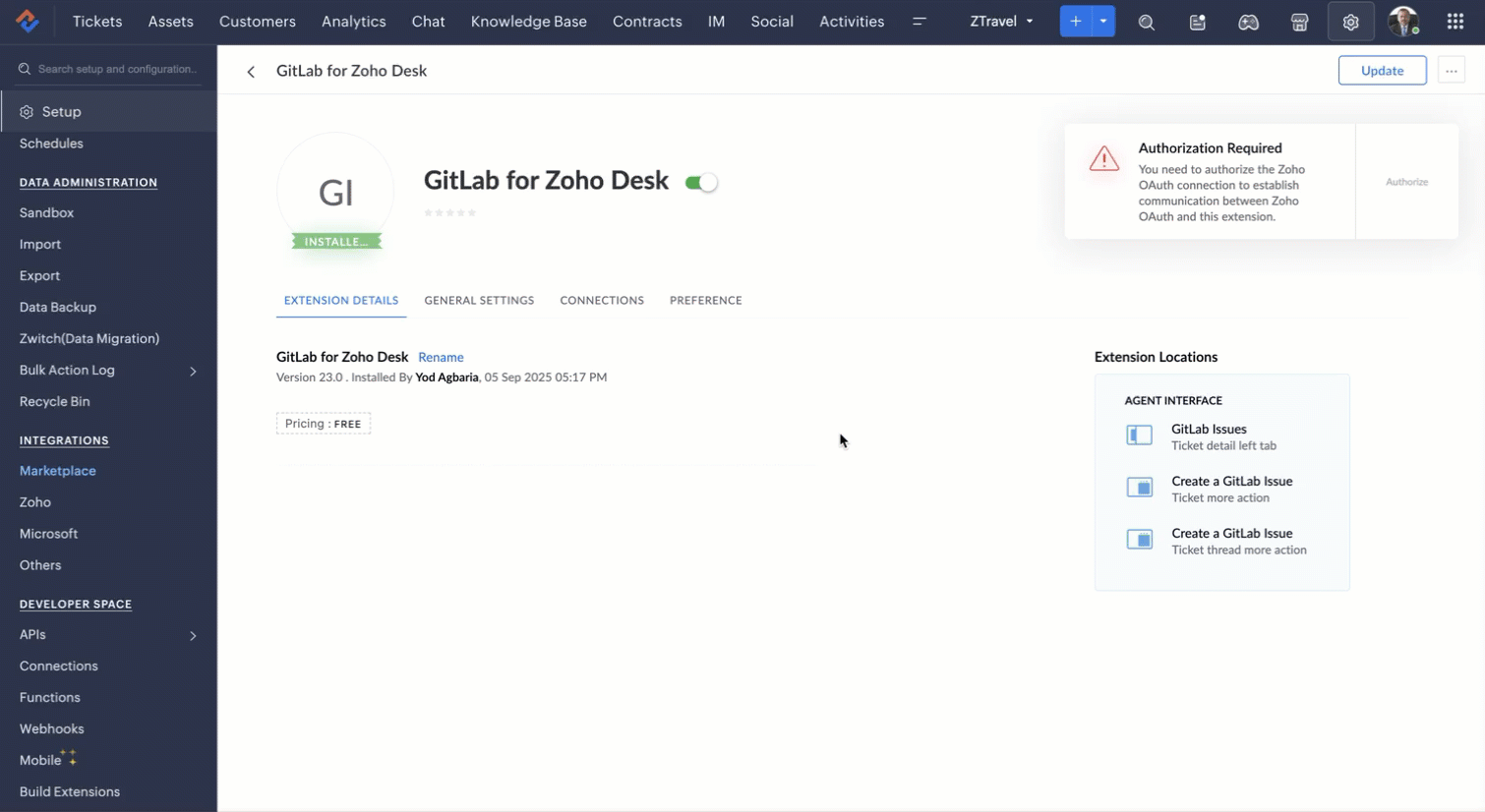 - Navigate to Setup > Integrations > Marketplace in Zoho Desk.