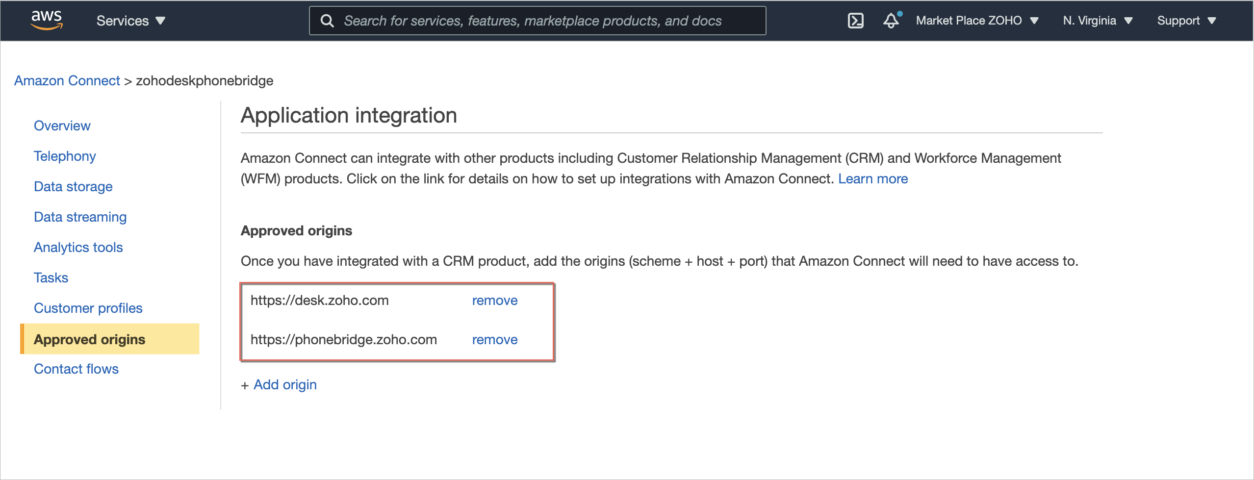 Before you enable this integration, please ensure that you have whitelisted the Zoho Desk domain to access the Amazon Connect instance.