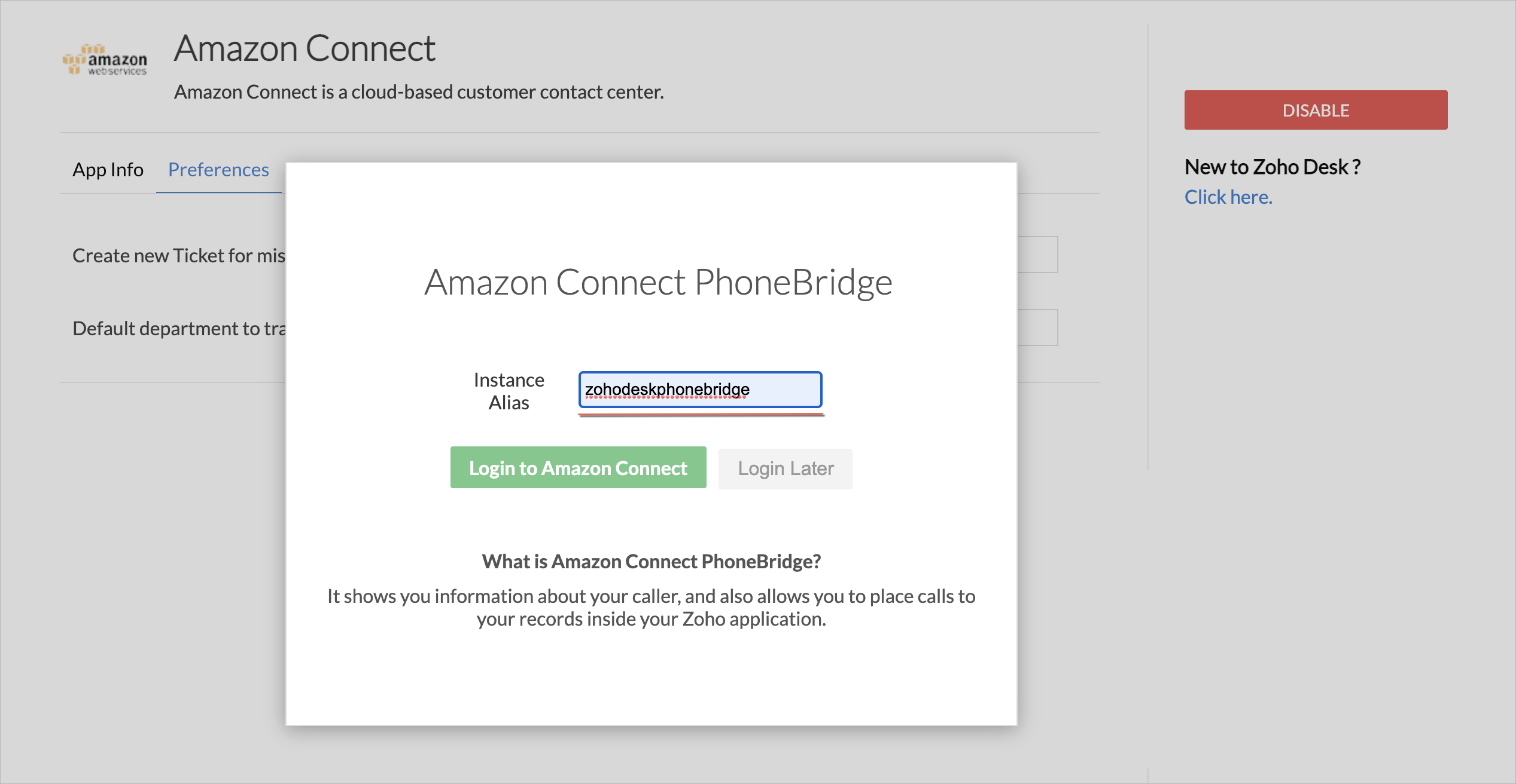 • On disabling the Amazon Connect integration, you will no longer be able to make calls in Zoho Desk via Amazon Connect.