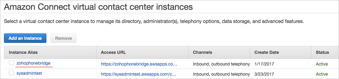 1. Enter the Instance Alias that you created for Zoho Desk in your Amazon console.