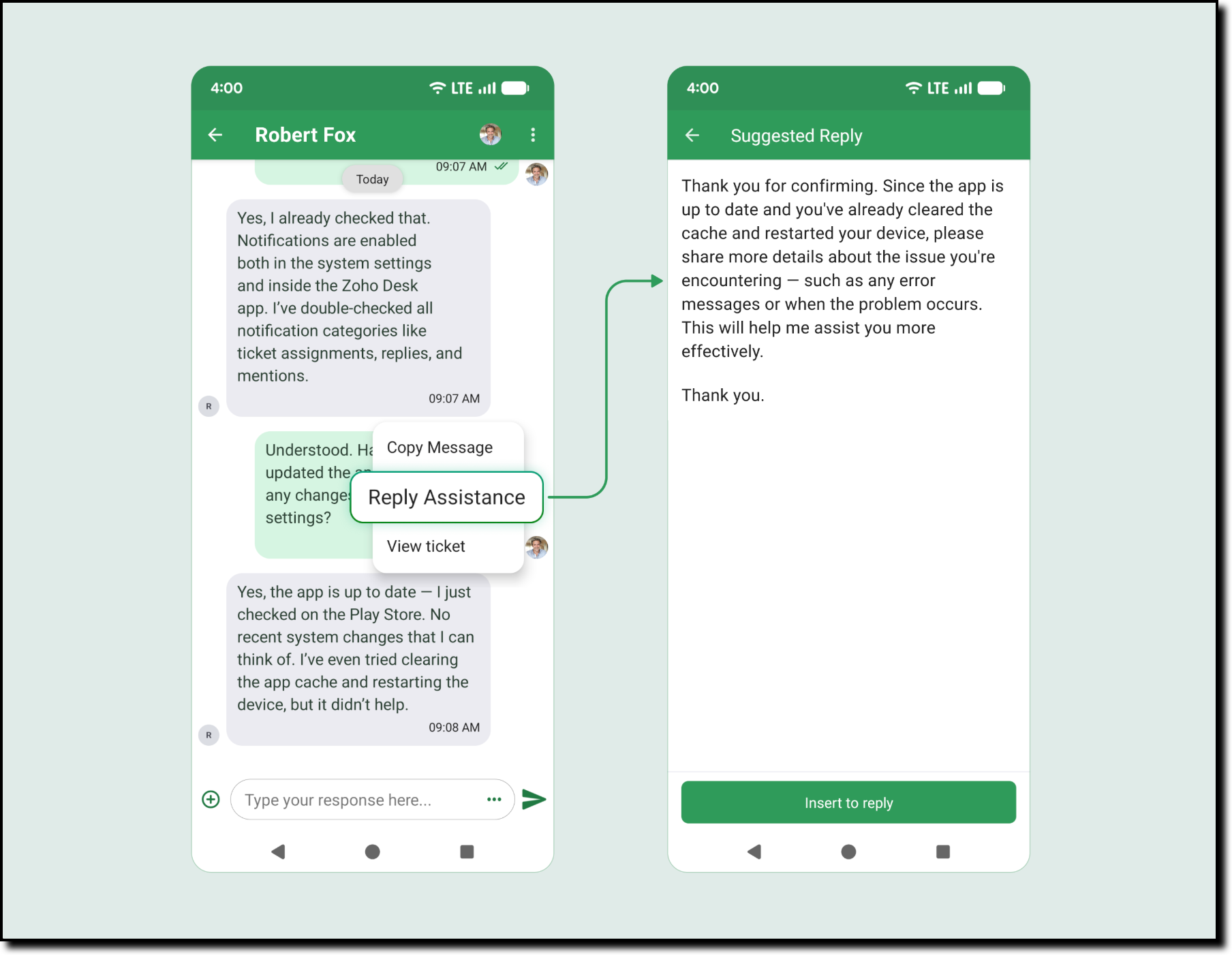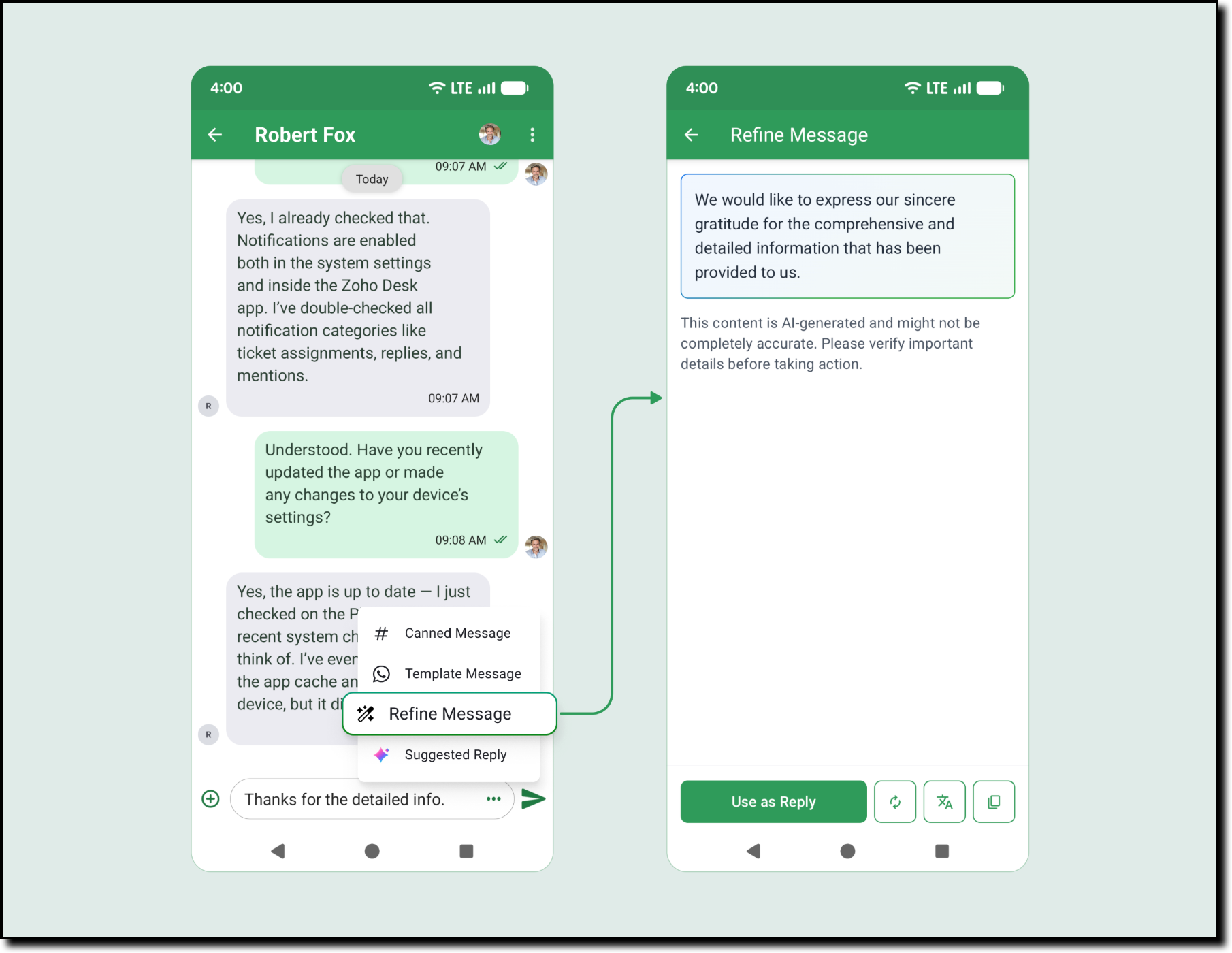 - Tap Use as Reply to use the generated content as a reply to the ticket.