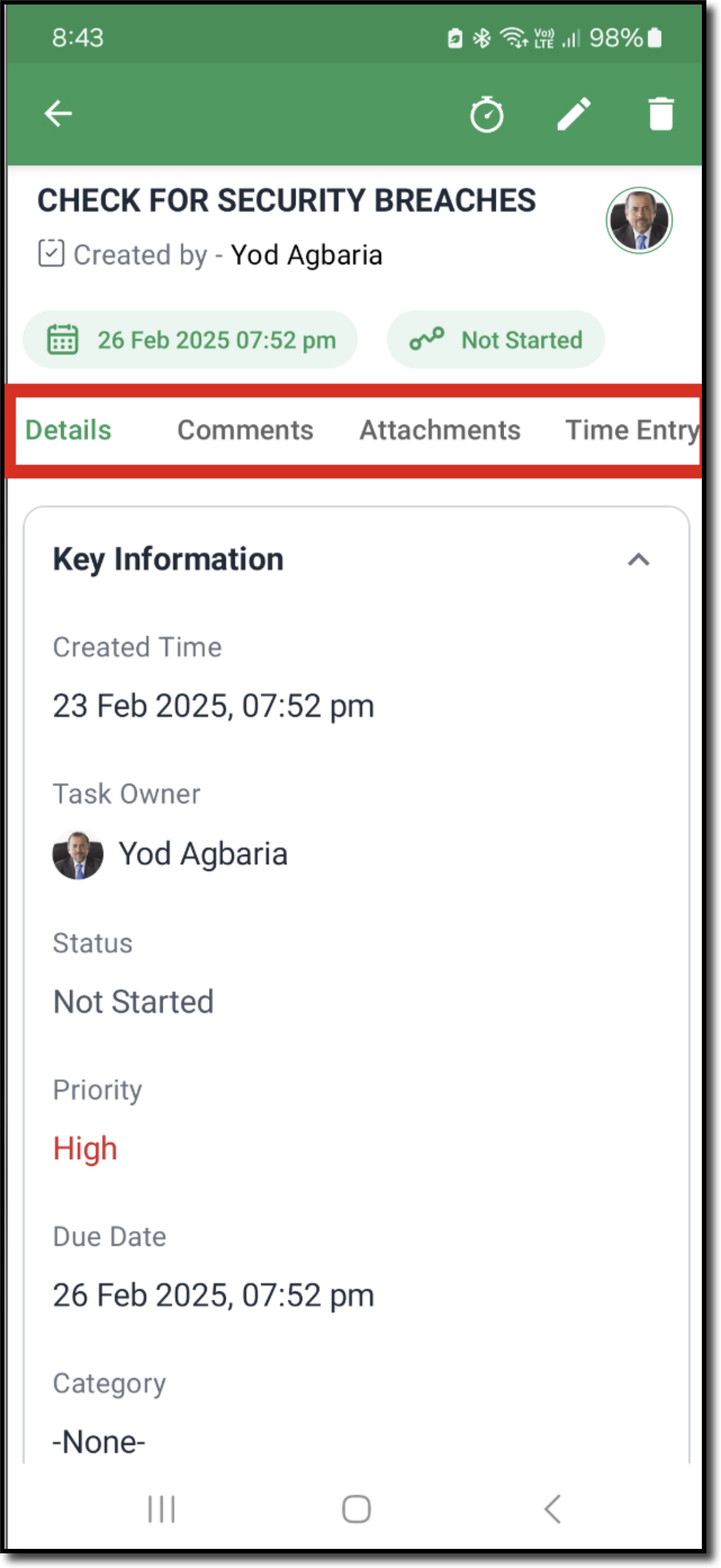 There can also be stand-alone tasks. For example, a user can create a task to perform a routine security scan, conduct a training session for new employees, etc. that are unrelated to a ticket.