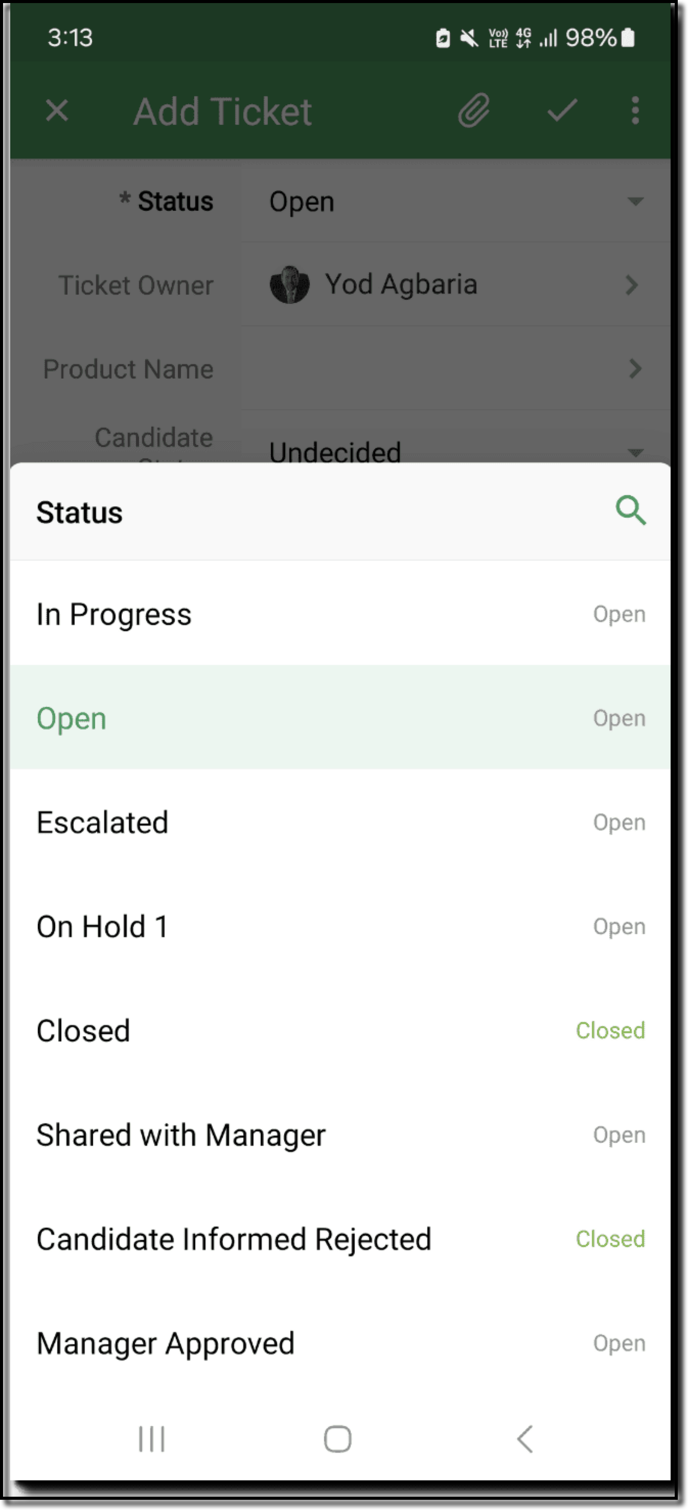 1. In an open ticket, tap the existing status and change it to the required status from the list.