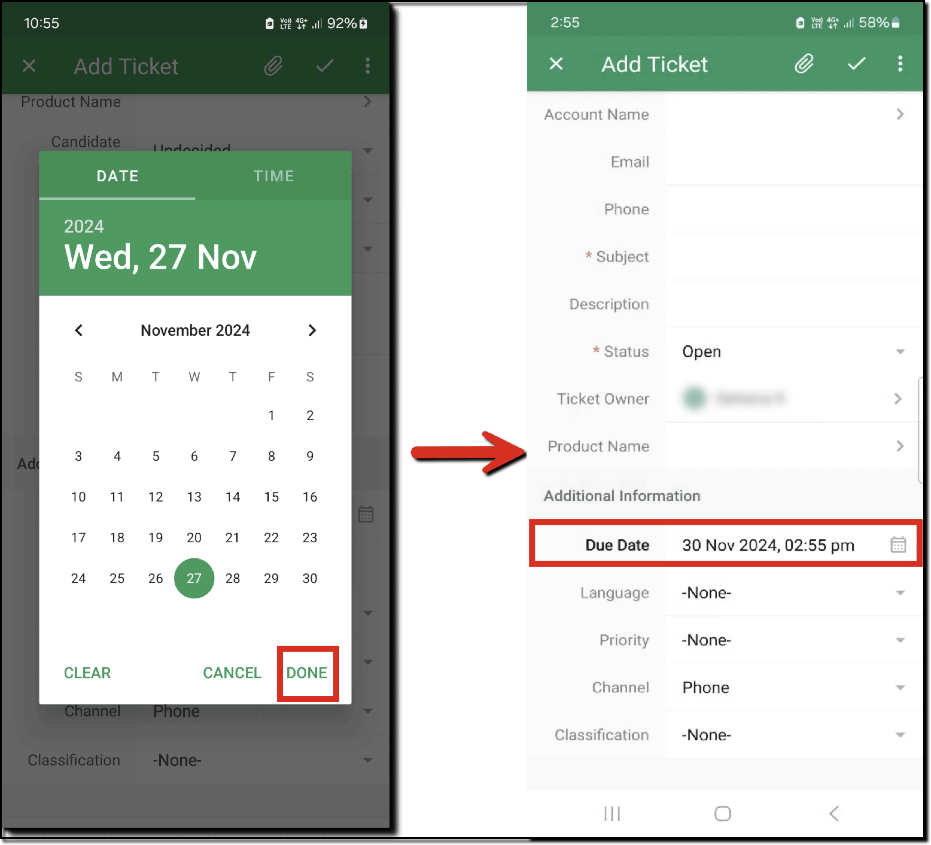2. In the Add Ticket page, under Additional Information, tap the calendar icon  to set the due date for the ticket.