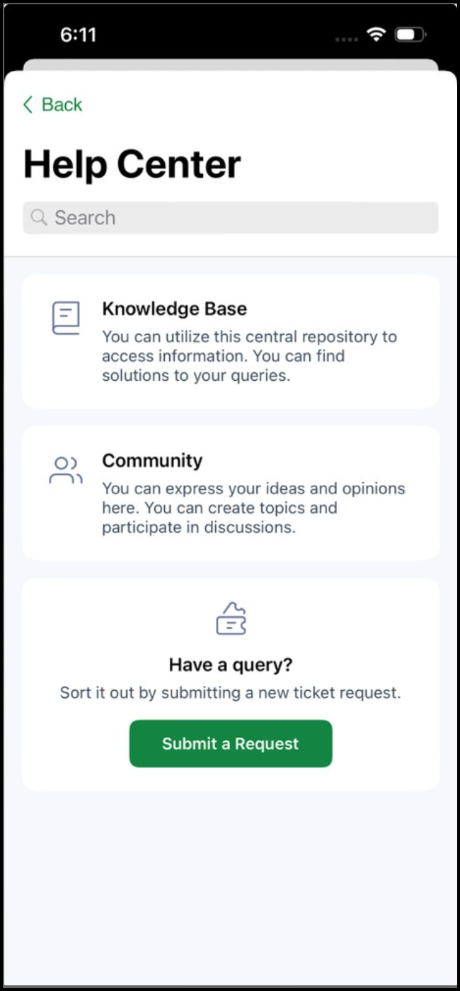 The users can reach the Help Centre to find answers to the most frequently asked questions through the Knowledge Base and Community. They can also submit a ticket for their queries from the help center.
