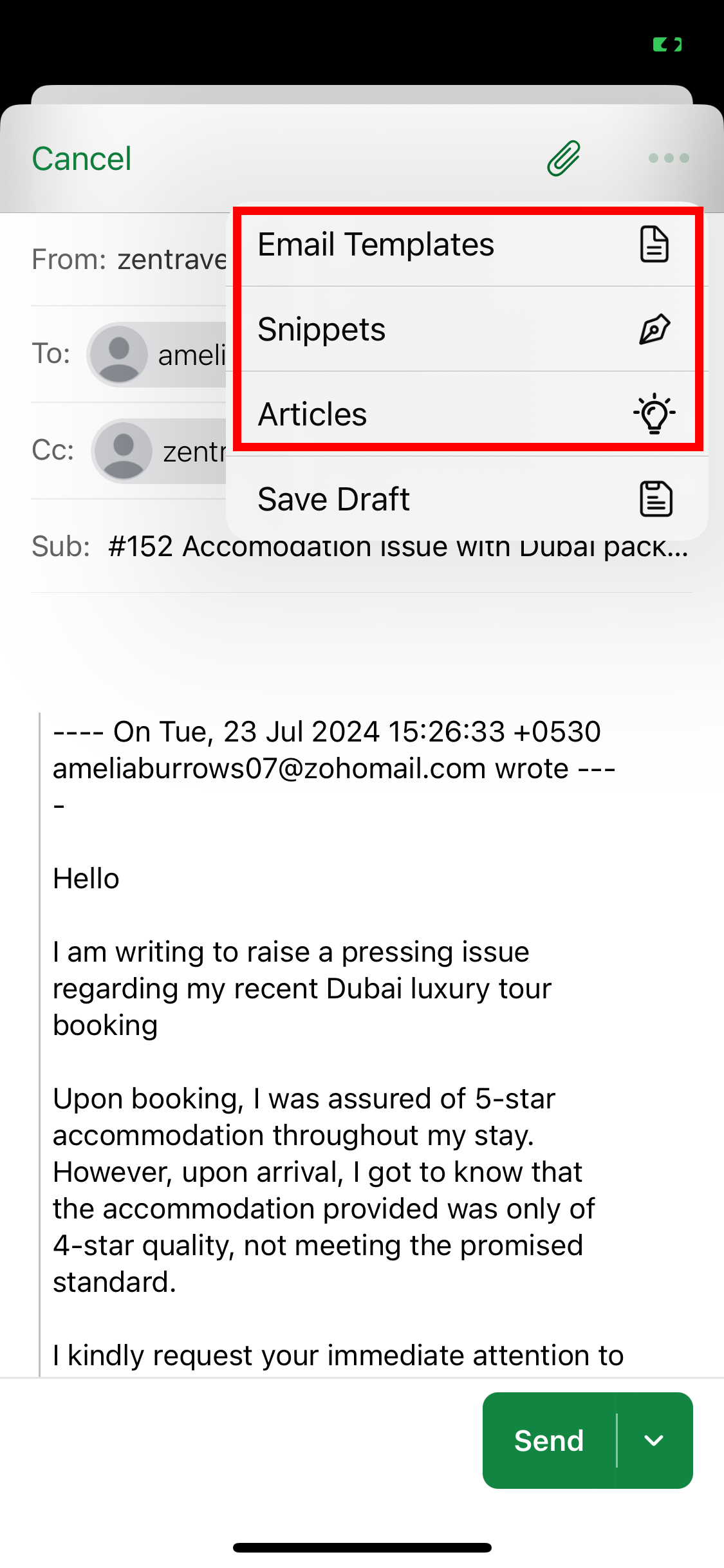 - Email templates: Choose from a selection of email templates to respond quickly with pre-written content that you can customize as needed.