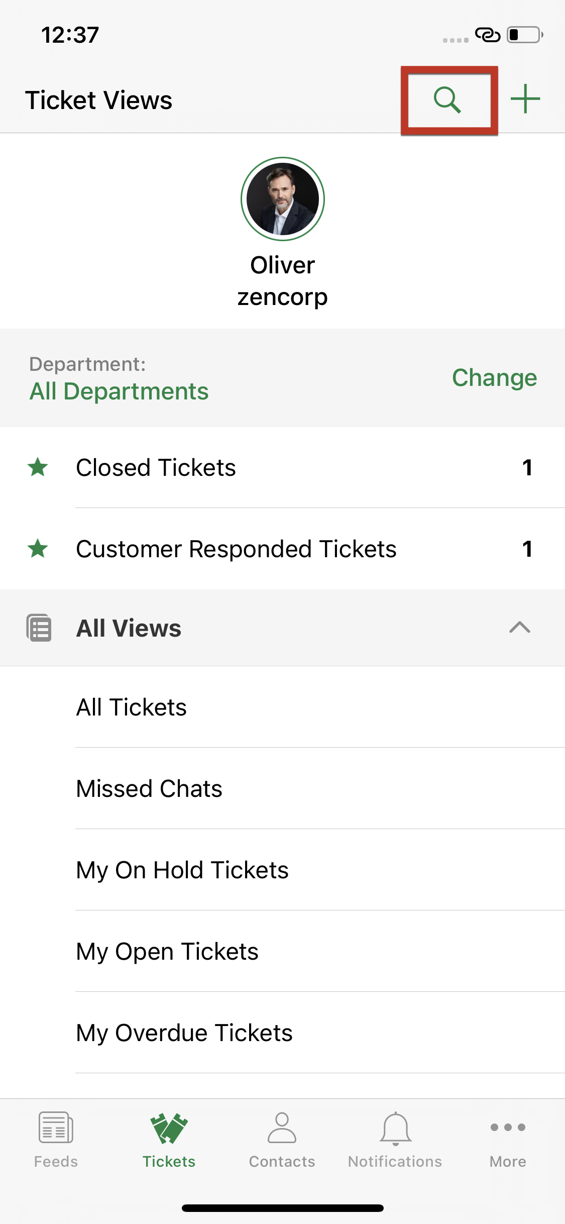 - In the Search Tickets field, enter your search text and tap Search on the keyboard.