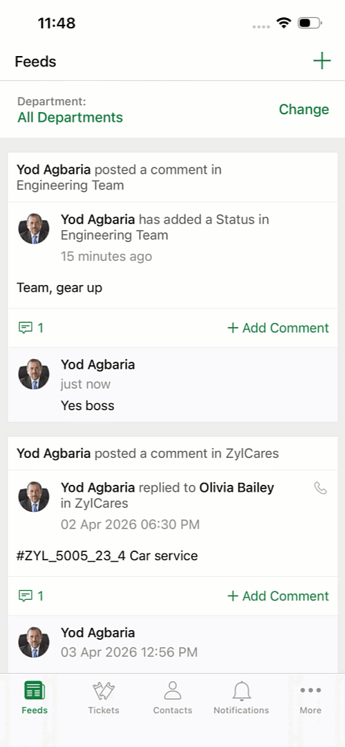Feeds in Zoho Desk is a feature that helps agents find a collection of status messages, mentions, comments, direct messages, changes made to the tickets they own, closing tickets, assigning tasks, creating events, and so on.