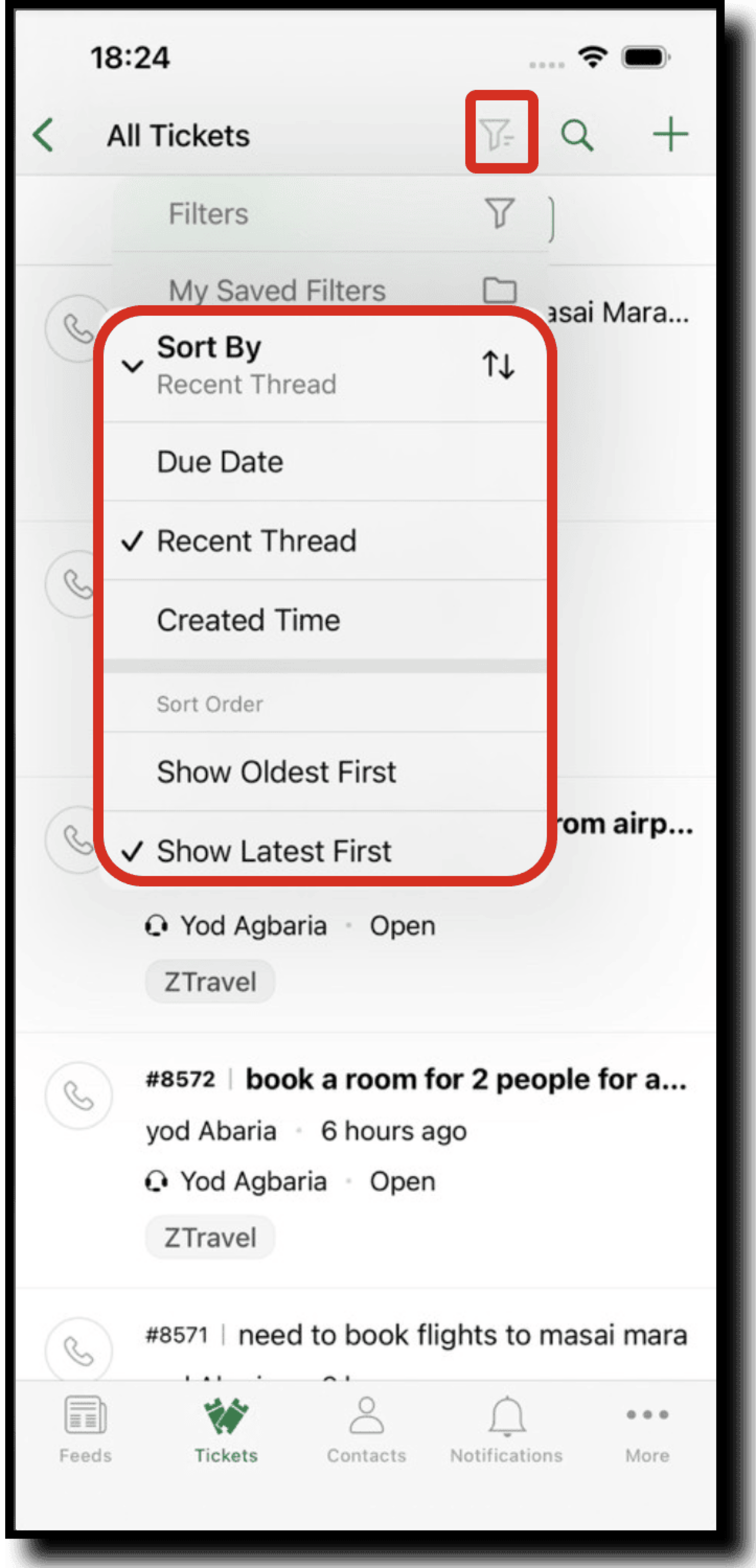 - Agents can view the saved filters by tapping on the filter icon > My saved filters. They can also rename and delete the saved filters through the more icon.
