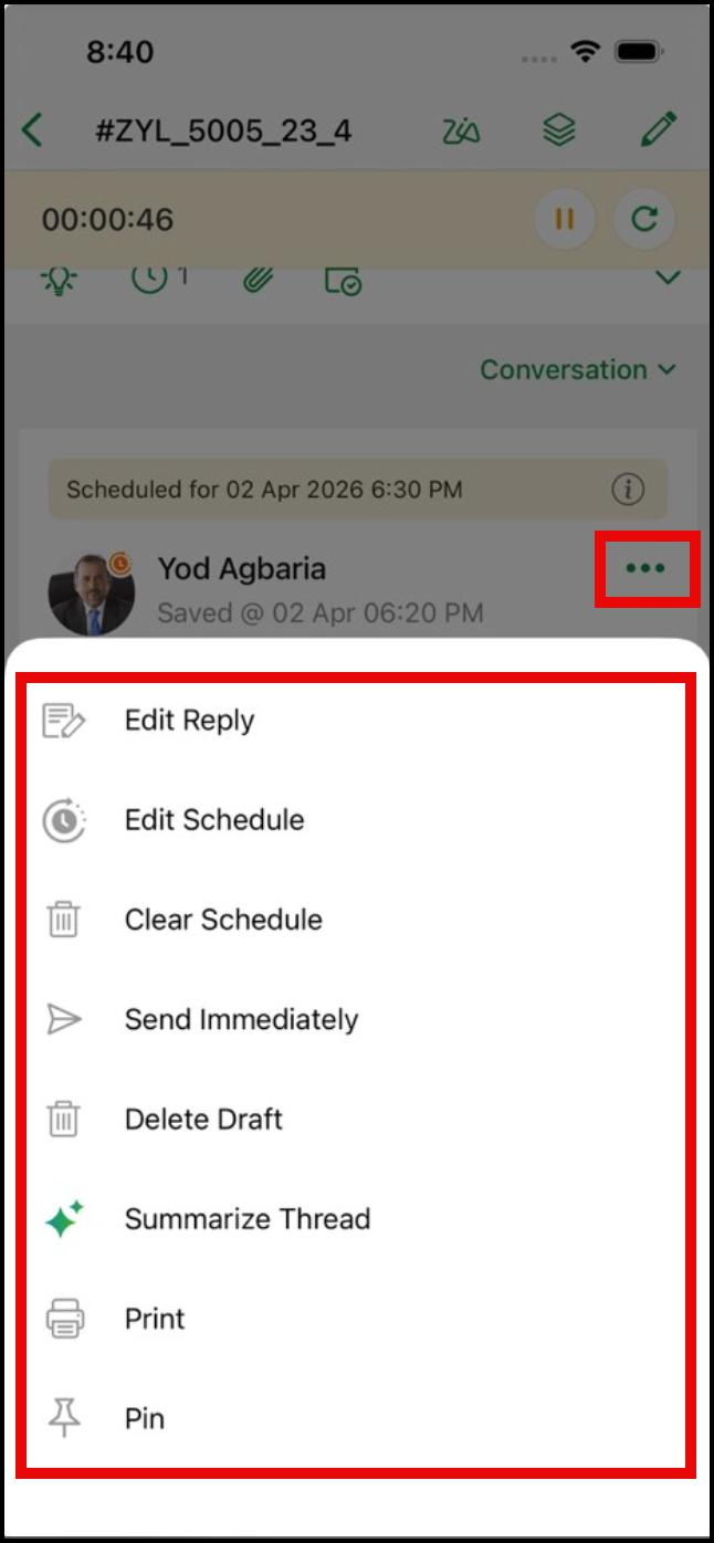 Once a reply is scheduled for a ticket or conversation thread, users can take further actions to manage and optimize the communication process. The following actions can be performed from the More icon under scheduled reply.