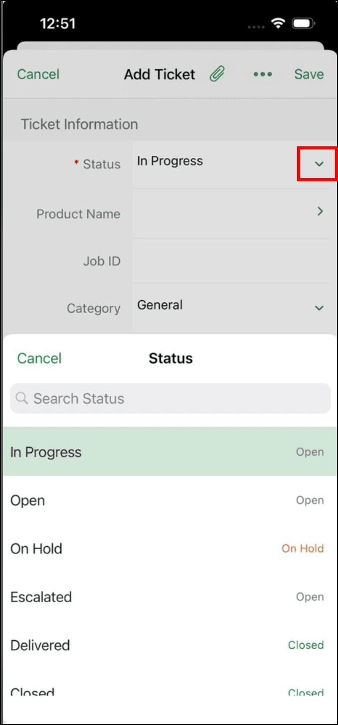 - In the ticket, tap the existing status and change it to the required status from the list.