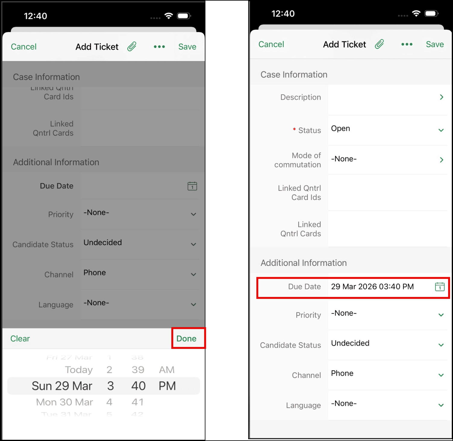 icon near due date to set the due date for the ticket. - After selecting the desired date and time in the displayed calendar, click Done.