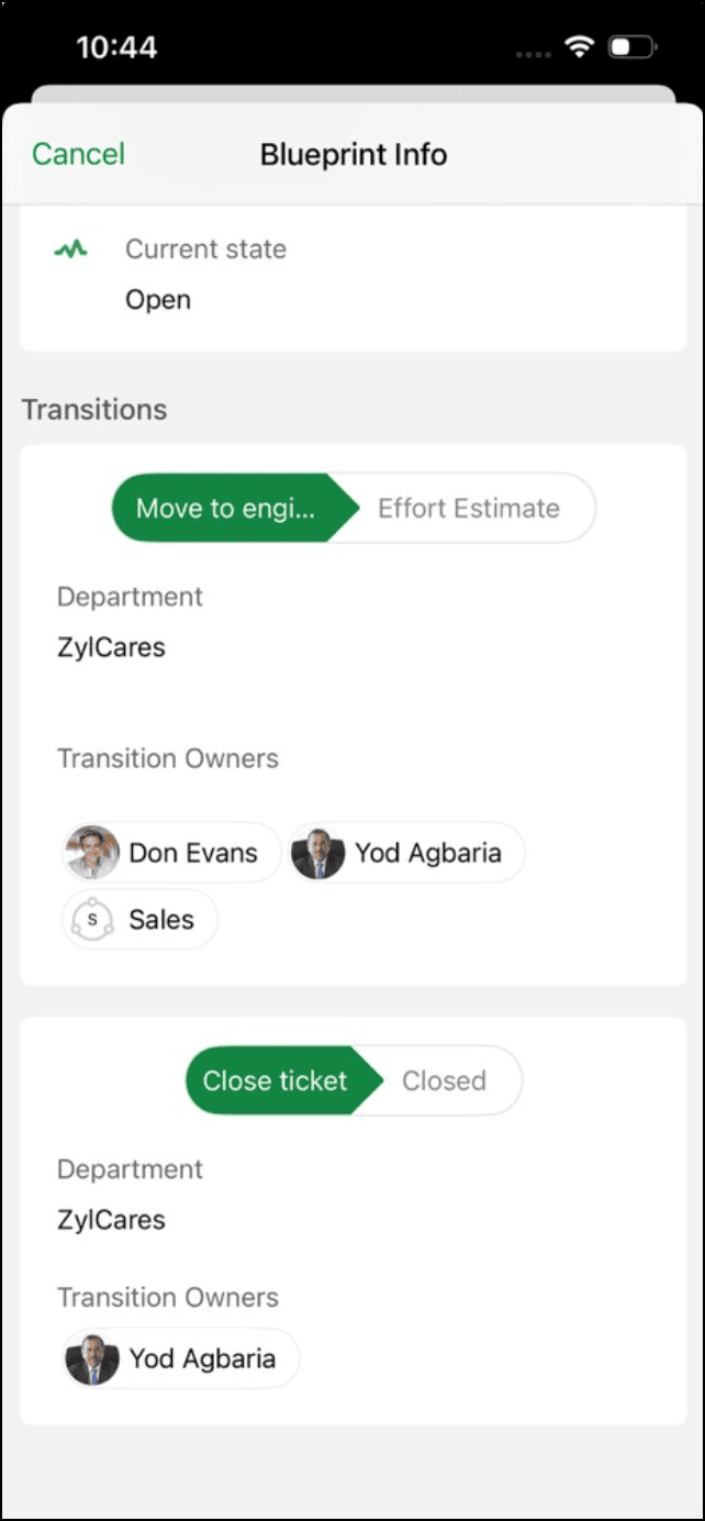 - In the ticket, tap the existing status to view the blueprint transitions.