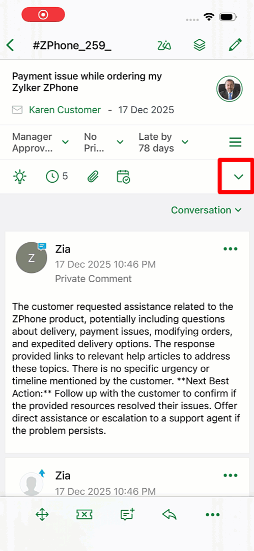 Agents can choose to view the complete history of the ticket or the ticket actions like adding comments, resolution, attachment, time entries, etc., they've made.