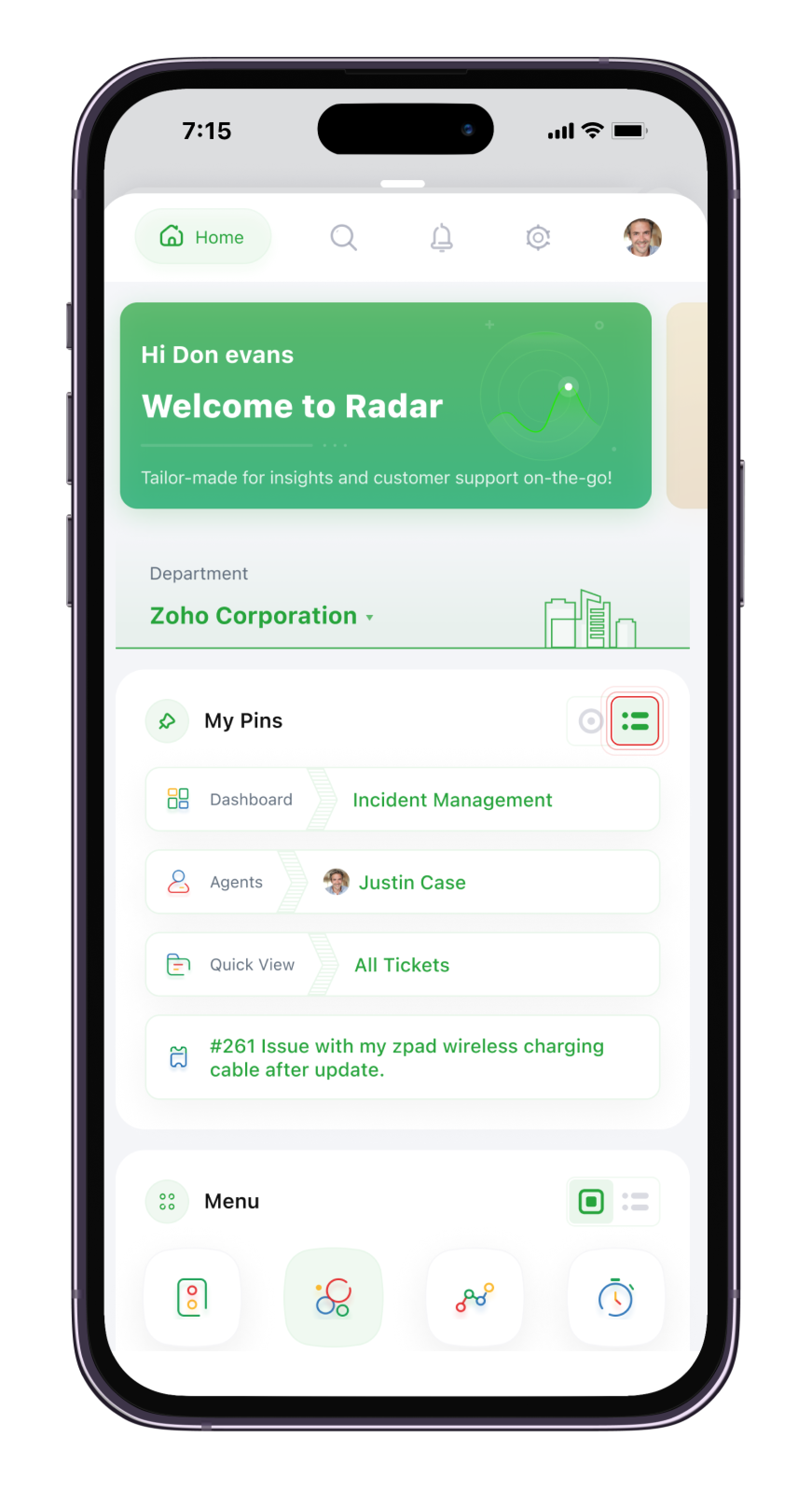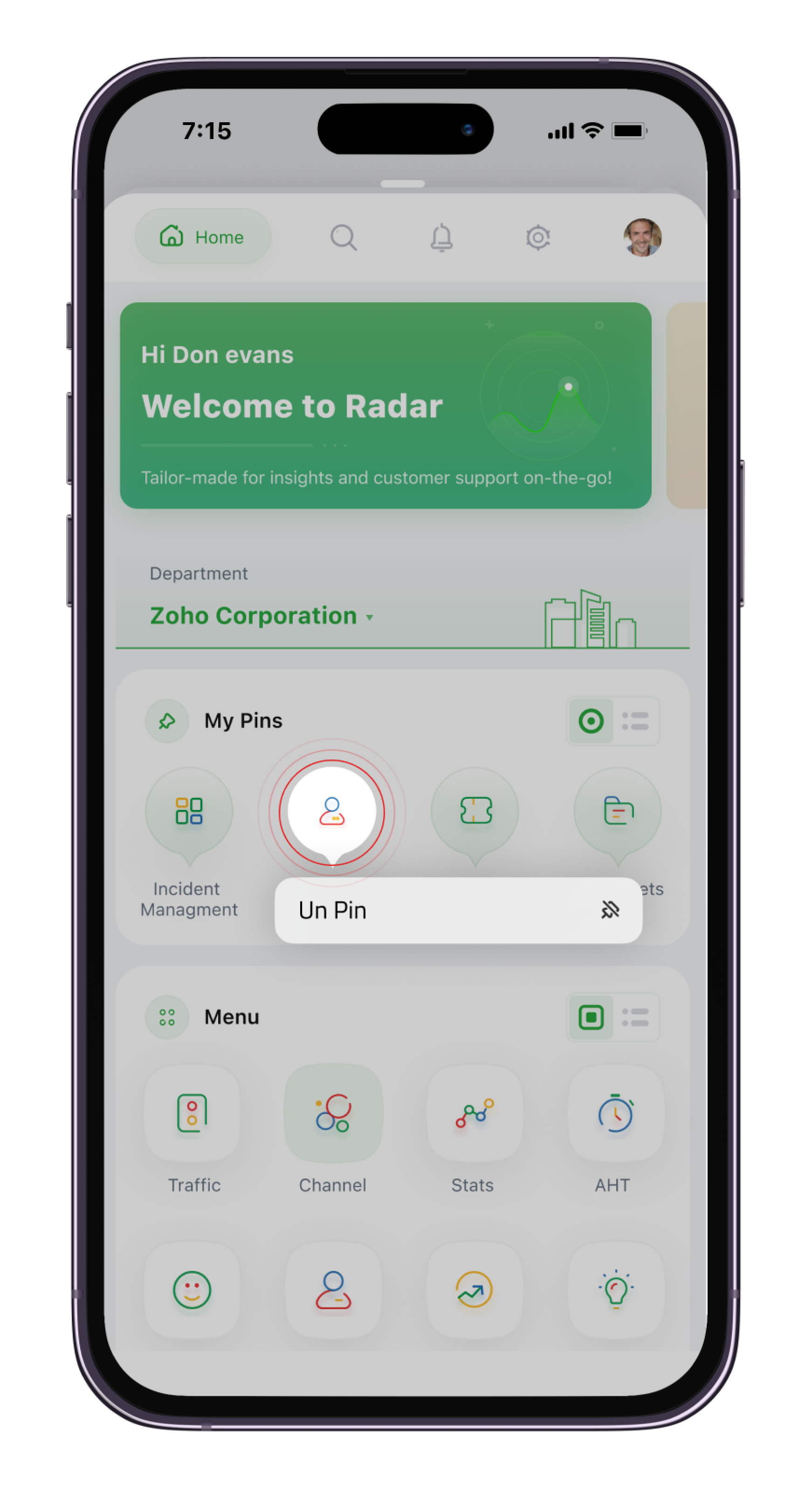 Help desk agents deal with large amounts of information on a quotidian basis. Each agent might have some information that they refer to frequently—It might be an important ticket or a critical dashboard. When such frequently consulted information is readily available to agents, they become more focused, motivated, and productive. Radar enables instant access to such relevant information via a nifty new feature — My Pins. You can now pin the information that is critical to you or the ones you frequently view to the Radar home and access it in a single click.