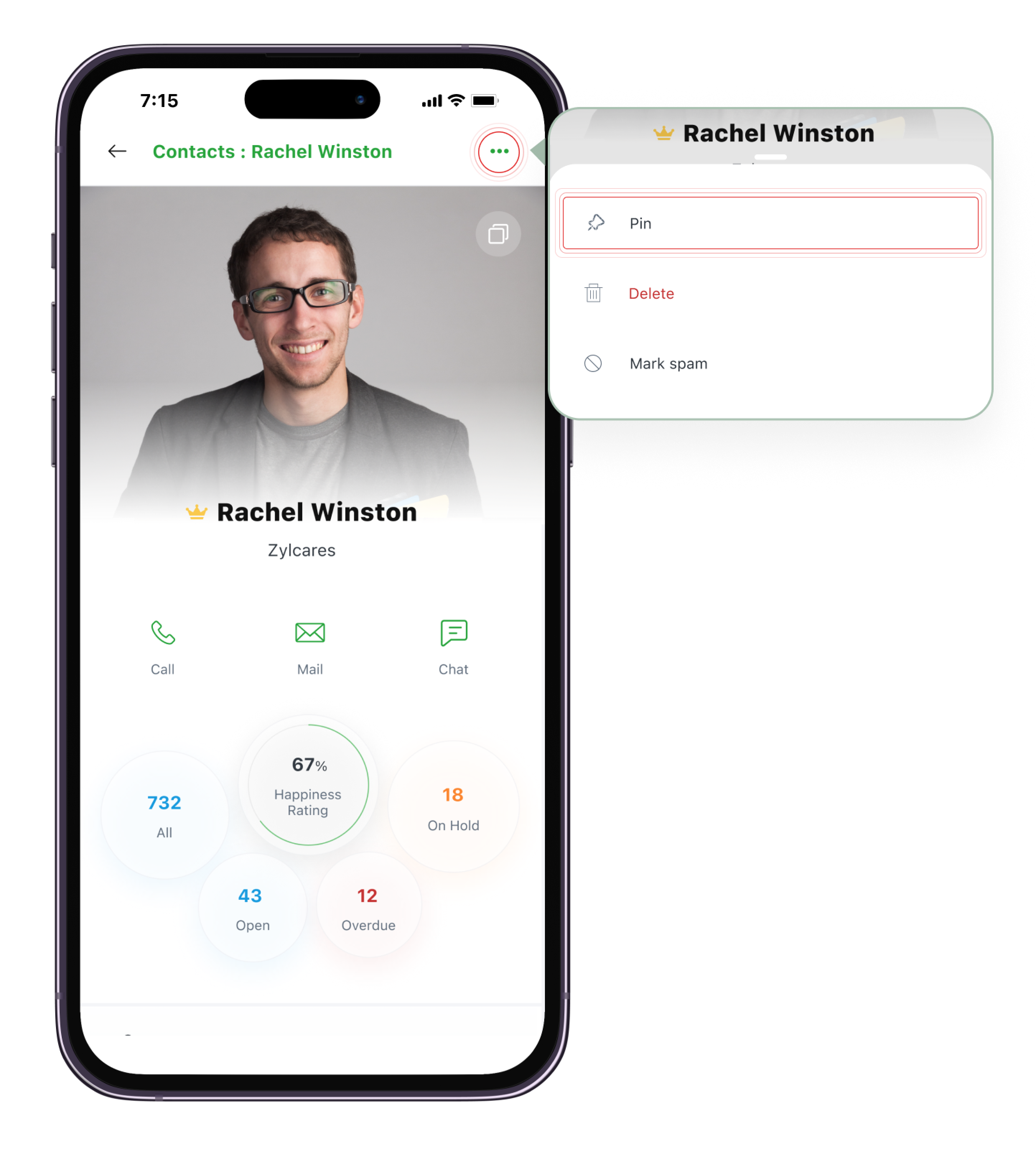 The contact card gives an overview of the tickets submitted by the contact along with personal information and other key support stats. To ensure extraordinary service is provided to your MVPs (Most Valuable Persons), you can tack their contact cards on the home.
